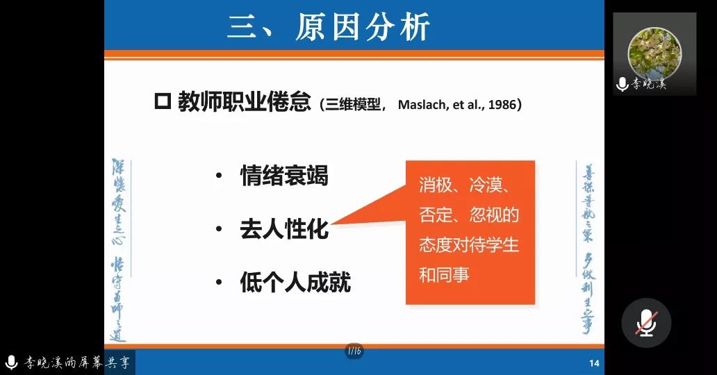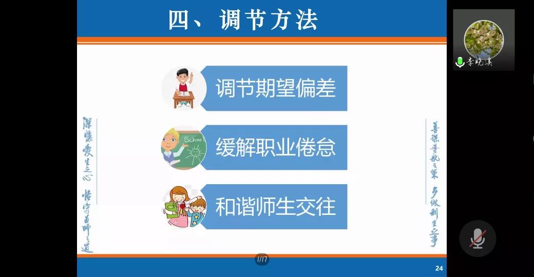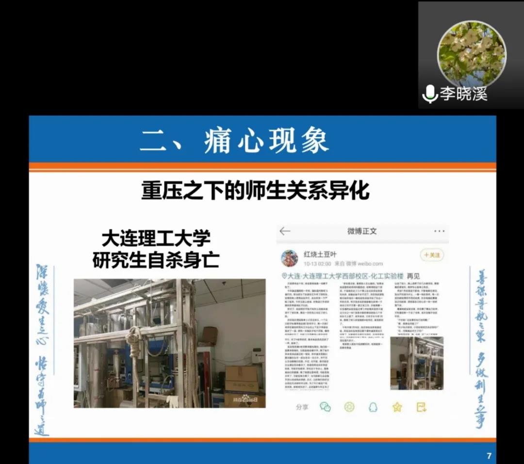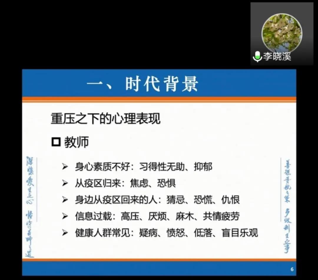 李晓溪博士首先介绍了人们在疫情背景下经历警戒反应期、抵抗期、疲劳期的持续性应激的发展过程。随后,李晓溪博士向与会教师详细描述了重压之下教师的心理表现,并通过分析研究生自杀身亡等案例揭示出社会上现存的师生关系异化现象。基于背景分析,李晓溪博士继而从学生、教师、 师生交往三个维度对师生关系异化的原因进行了解读。李晓溪博士表示导致此问题的因素主要有学生期望与教师本身之间存在一定偏差、教师产生职业倦怠以及师生之间互动不良。最后,李晓溪博士向与会教师介绍了调节此类问题的方法:首先,教师需要帮助学生了解教师的角色,帮助其调整对教师的期望偏差。其次,教师要从自身出发,正确认识教师职业倦怠问题,通过行为转移法等有效方式对教师角色寄予合理的期望,以期缓解职业倦怠。另外,教师还可以通过赋予良好的期望,践行适宜的行为,实施民主的管理等方法与学生建立和谐的师生交往关系。