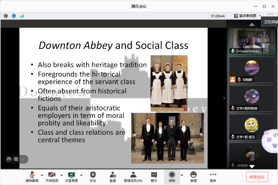 11月5日,伦敦布鲁奈尔大学商业、艺术及社会科学院副院长Sean Holmes博士结合个人研究成果,做了题为《<唐顿庄园>与英国通俗文化传统的承袭》的学术讲座。霍姆斯博士首先简短介绍了英国名剧《唐顿庄园》的创作背景,分析了该剧作为一种文化现象产生的重要影响,细致讲解了《唐顿庄园》展现的历史景象、社会阶级、性别问题等等,对于深刻认识与理解英国通俗文化传统的承袭具有重要指导意义。