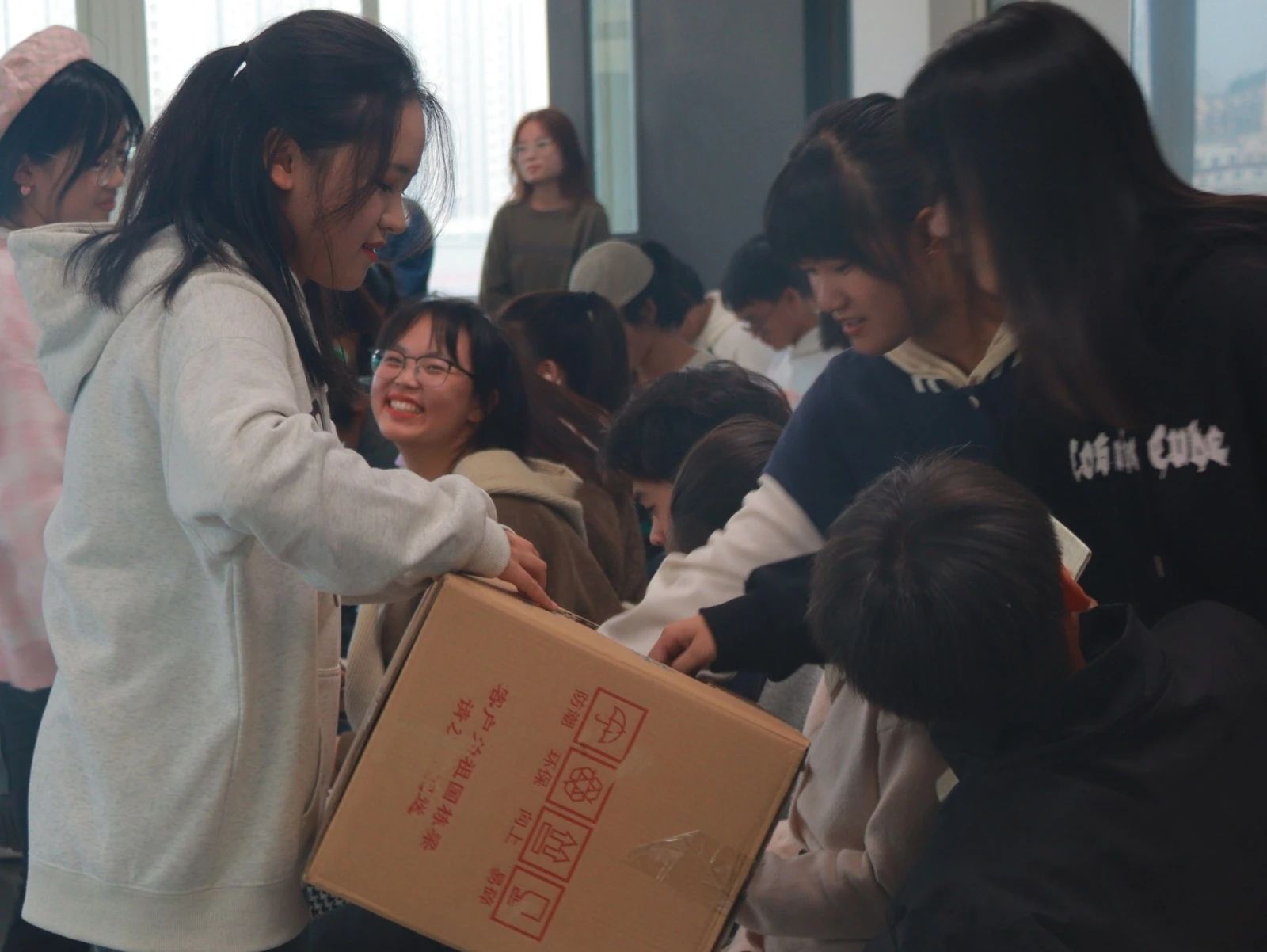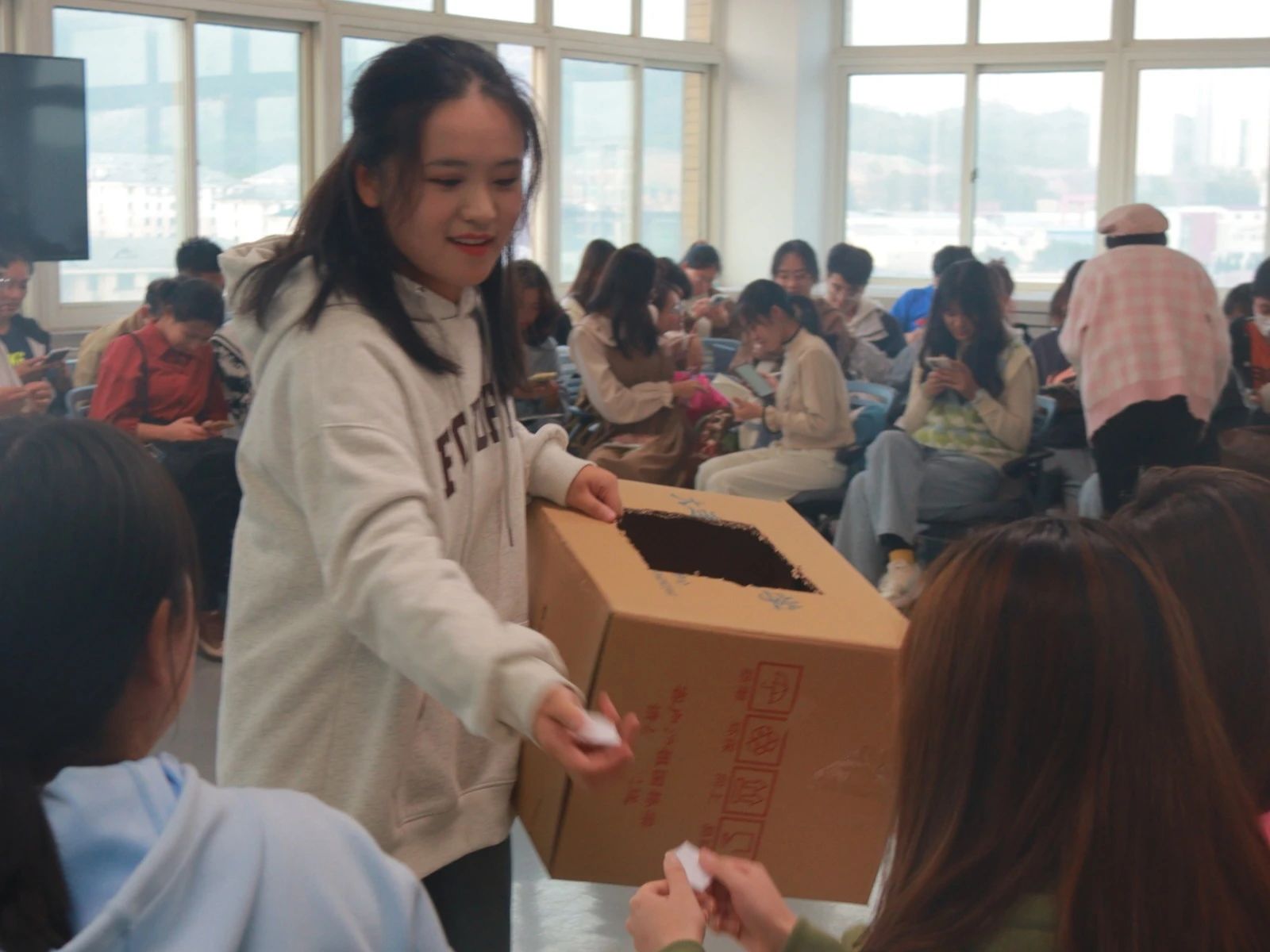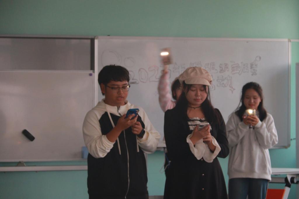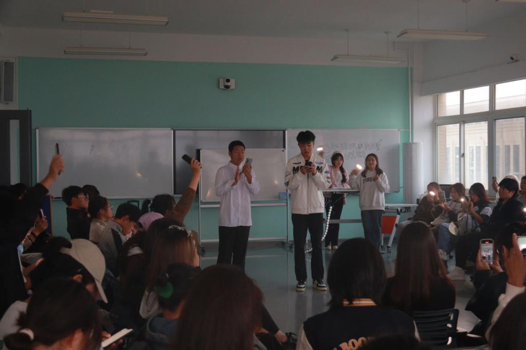 暖场游戏结束后,主持人安排 12 位年级组织成员上前进行自我介绍,其余人传递纸箱抽取卡片,并加上微信,如果两⼈抽到互相写的卡片,可任意指定一人接受惩罚。随后被指定的人纷纷上台大展歌喉,此刻夜幕降临,同学们手机的手电筒化作应援棒,带来点点星光。