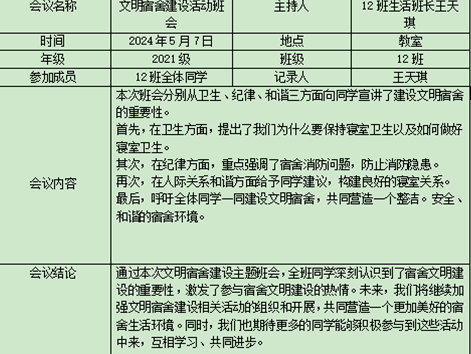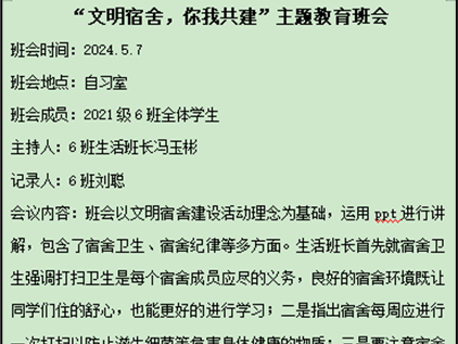 会后,各班生活班长结合会议精神开展主题教育班会,从寝室卫生、寝室纪律、寝室消防、寝室和谐等多方面鼓励同学们积极参与宿舍建设活动。