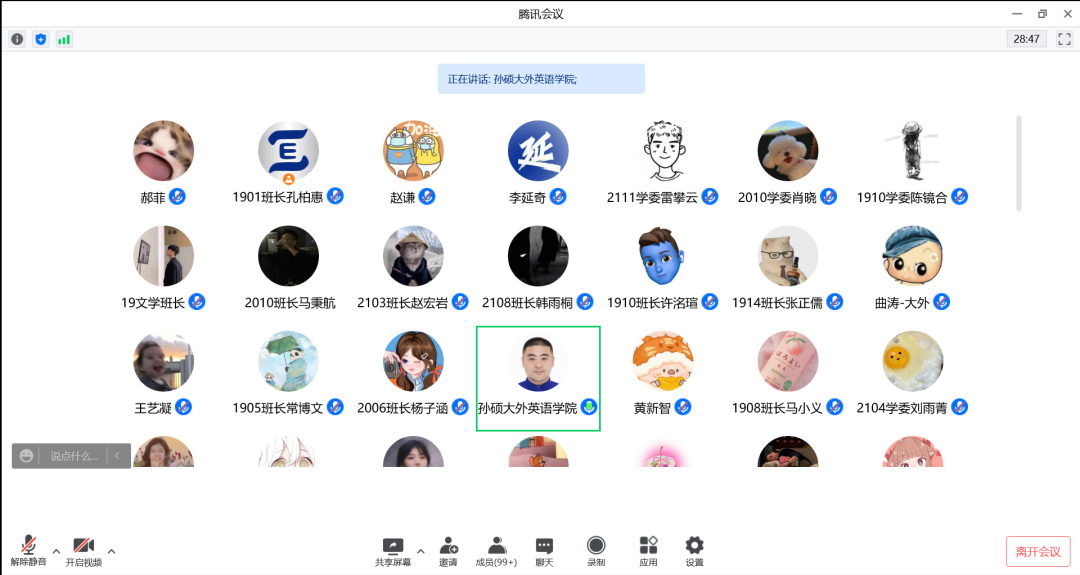 为加强英语学院学生们的劳动能力,提高学生们主动劳动的意识,贯彻实施教育部《大中小学劳动教育指导纲要》,贯彻党的教育方针,加快构建德智体美劳全面发展的教育体系,并积极落实大连外国语大学劳动教育实施方案,英语学院于4月29日晚,召开各年级班级班长、学委线上会议,部署英语学院劳动教育相关工作。英语学院党委副书记孙硕、副院长曲涛、分团委书记曲镜达、各年级辅导员及教学秘书赵谦出席了会议。