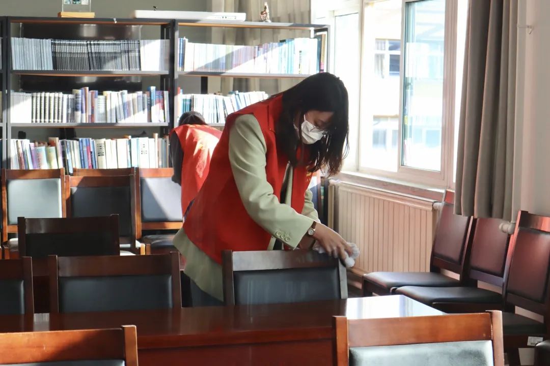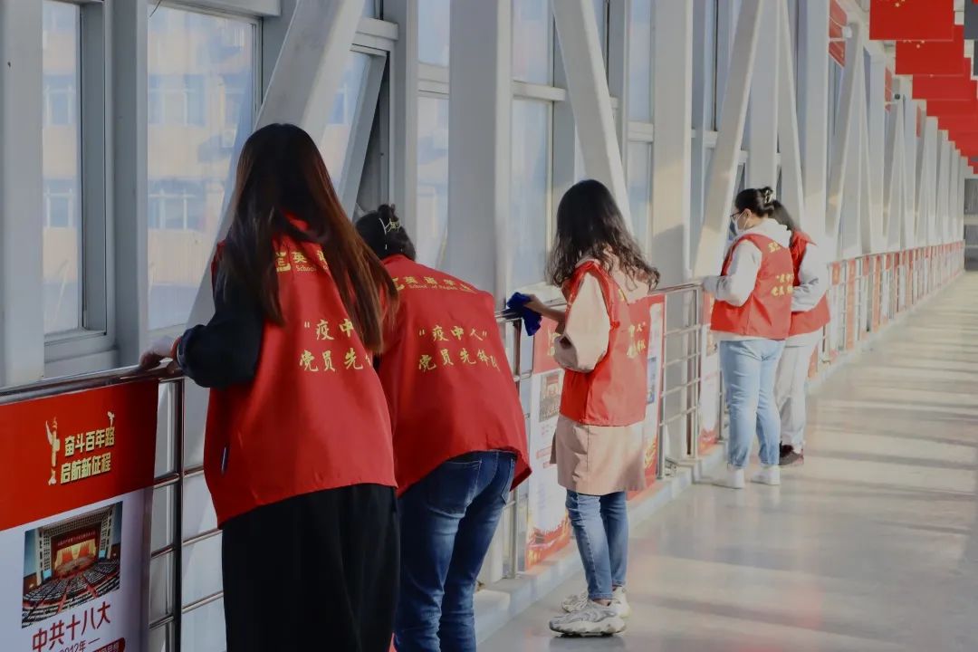 清扫工作中,党员们分工合作、互帮互助、热情四溢、斗志昂扬,充分发扬了党员先锋队“不怕脏、不怕苦、不怕累”的精神。本科生第一党支部的党员们仔仔细细地擦拭了党史书屋的书架和VR实训中心的桌椅窗台,并清理了盆栽枯死的枝叶;本科生第二党支部的党员们对爱尔兰中心的桌椅书架橱柜和党史长廊的扶手栏杆进行了清洁;研究生党支部的党员们则擦拭了各教室内部的书柜并将桌椅摆放整齐。