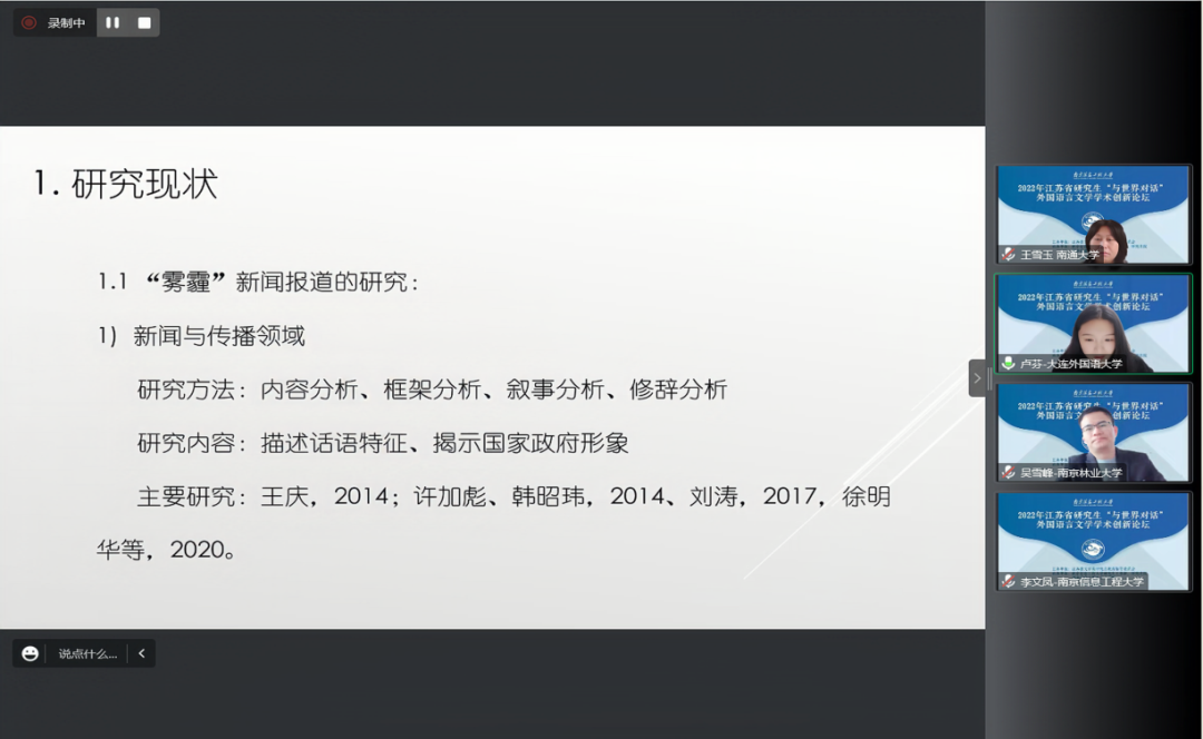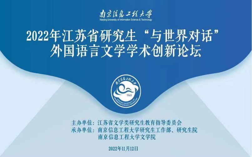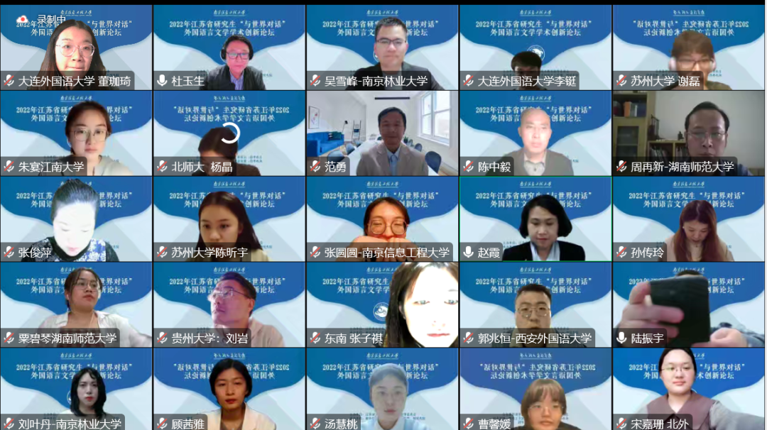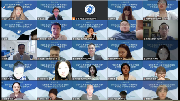 2022年11月12日,来自江苏、北京、辽宁等12个省、直辖市共25所高校近百名外国语言文学博士、硕士研究生相聚云端,参加2022年度江苏省研究生“与世界对话”外国语言文学学术创新论坛。本次论坛由江苏省文学类研究生教育指导委员会主办,南京信息工程大学文学院承办。我院2020级和2021级的4名研究生在教研室主任林璐教授带领下参加了此次论坛。