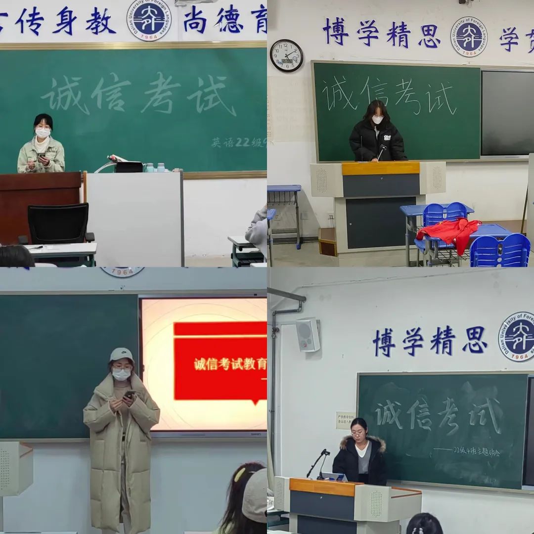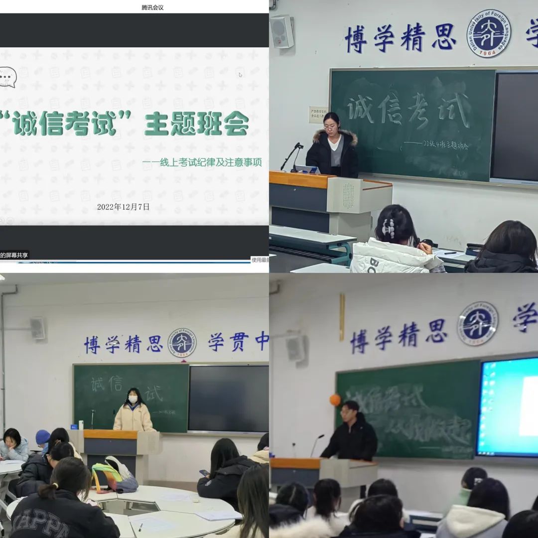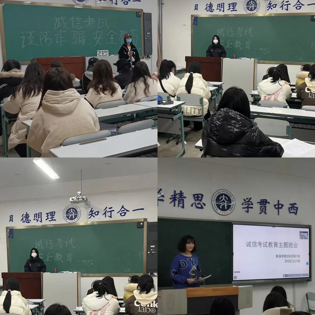 为严肃考风考纪,推动优良考风建设,同时保障同学们安全度过假期,平安迎接新年,英语学院2022级各班于12月7日开展诚信考试暨安全假期宣传主题班会。