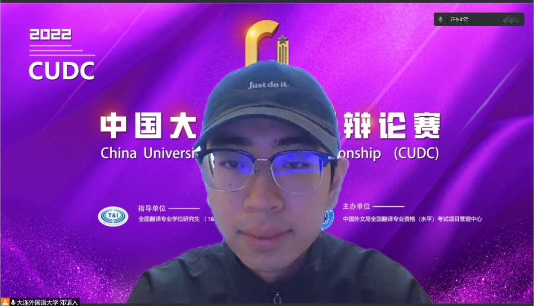 谈及此次比赛,孙芳睿和邓语人同学共同表示,他们非常感谢辩论俱乐部陆文玥老师的帮助以及学院领导老师所给予的大力支持。此次CUDC全国总决赛高手云集,竞争十分激烈。从模拟辩论到辩论复盘,从日积月累的阅读积累到坚持不懈的表达输出,两位同学在赛前认真积极备赛。由于无法同框参赛,两位同学需要在辩题发布后短短15分钟内,准备自己的辩题内容的同时,又要克服异地比赛的种种不便,在线上完成与对方的沟通。此外,本次决赛共五轮,赛程安排十分紧密。这次比赛不仅仅是一场脑力战,更是一场体力战。最后,在激烈的角逐中,两名同学连续两场获得了小组第一名,最终获得了全国总决赛二等奖。