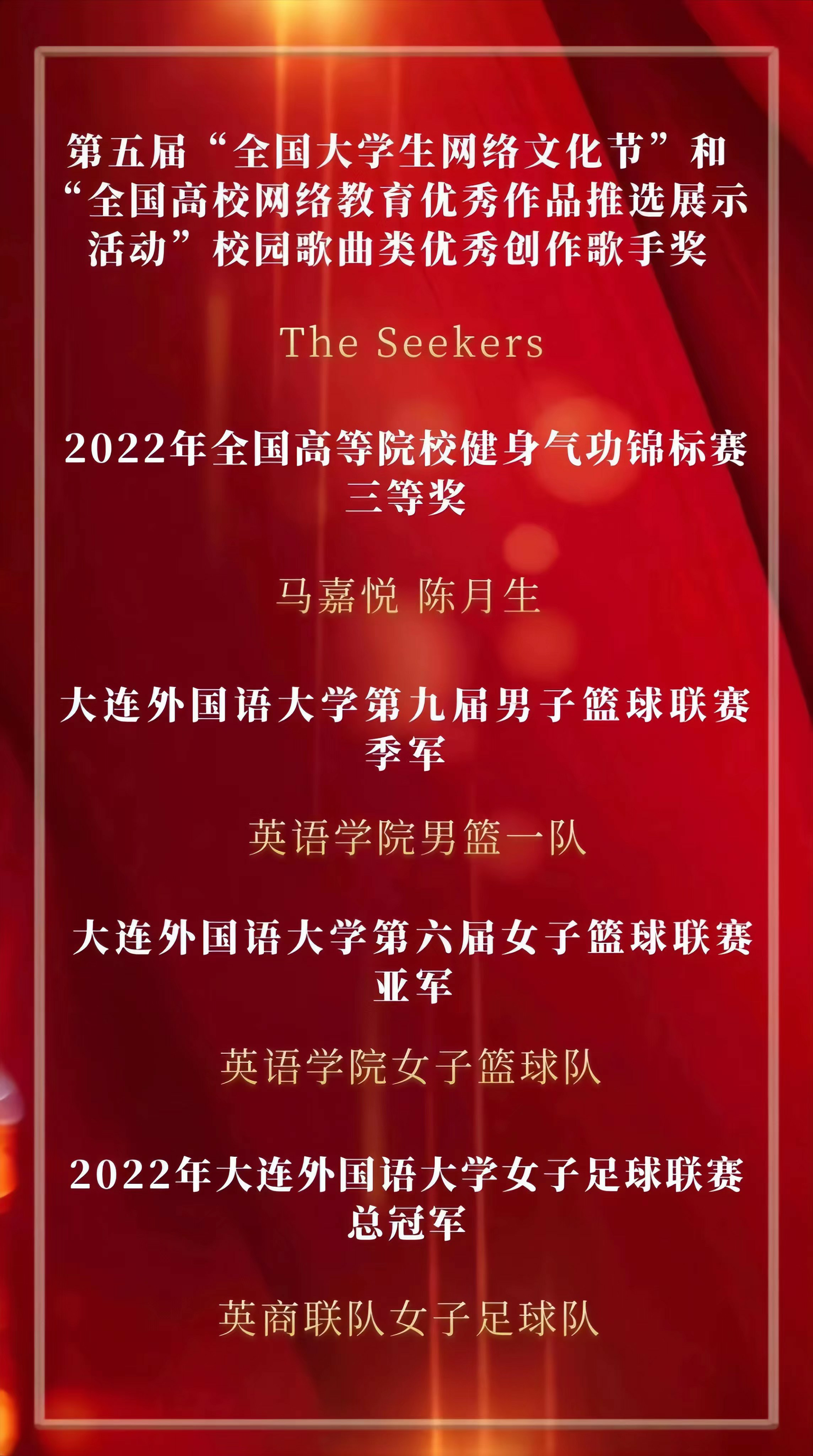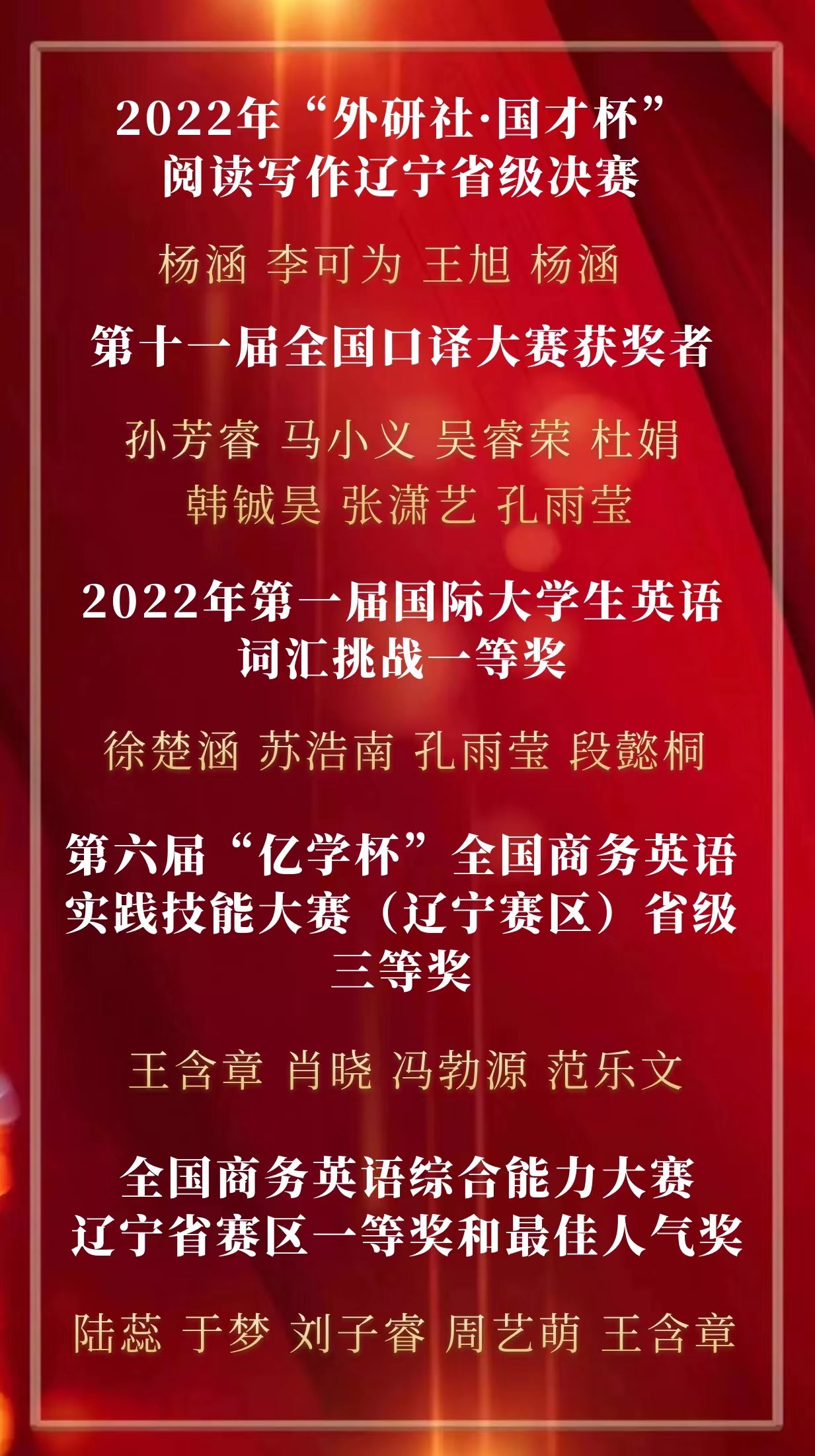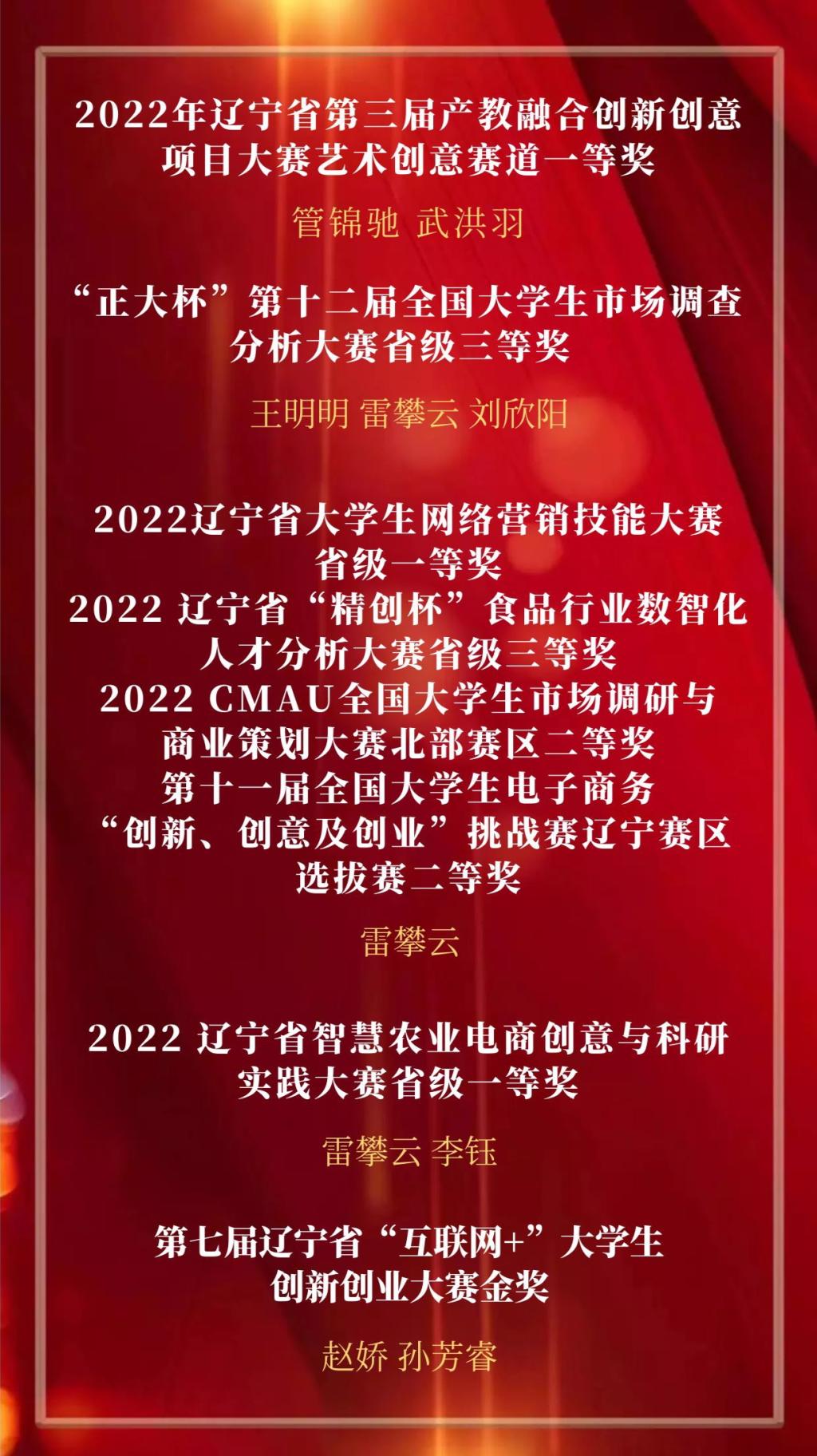 2022年英语学院“青春榜样,荣耀英院”云颁奖典礼至此告一段落,让我们向上述获奖同学致以最诚挚的祝贺!韶华如驶,时光如掷,2022年即将结束,是同学们的孜孜不倦、刻苦奋斗,以及老师们的耐心教授、悉心指导才使他们能够获得这些荣誉。含英咀华,妙语生花;文修励学,与英笃行。眼有星辰大海,心有繁花似锦。2023年,我们定会不负心中所爱,奔赴下一场山海。(况彦萱 陈玥凝)