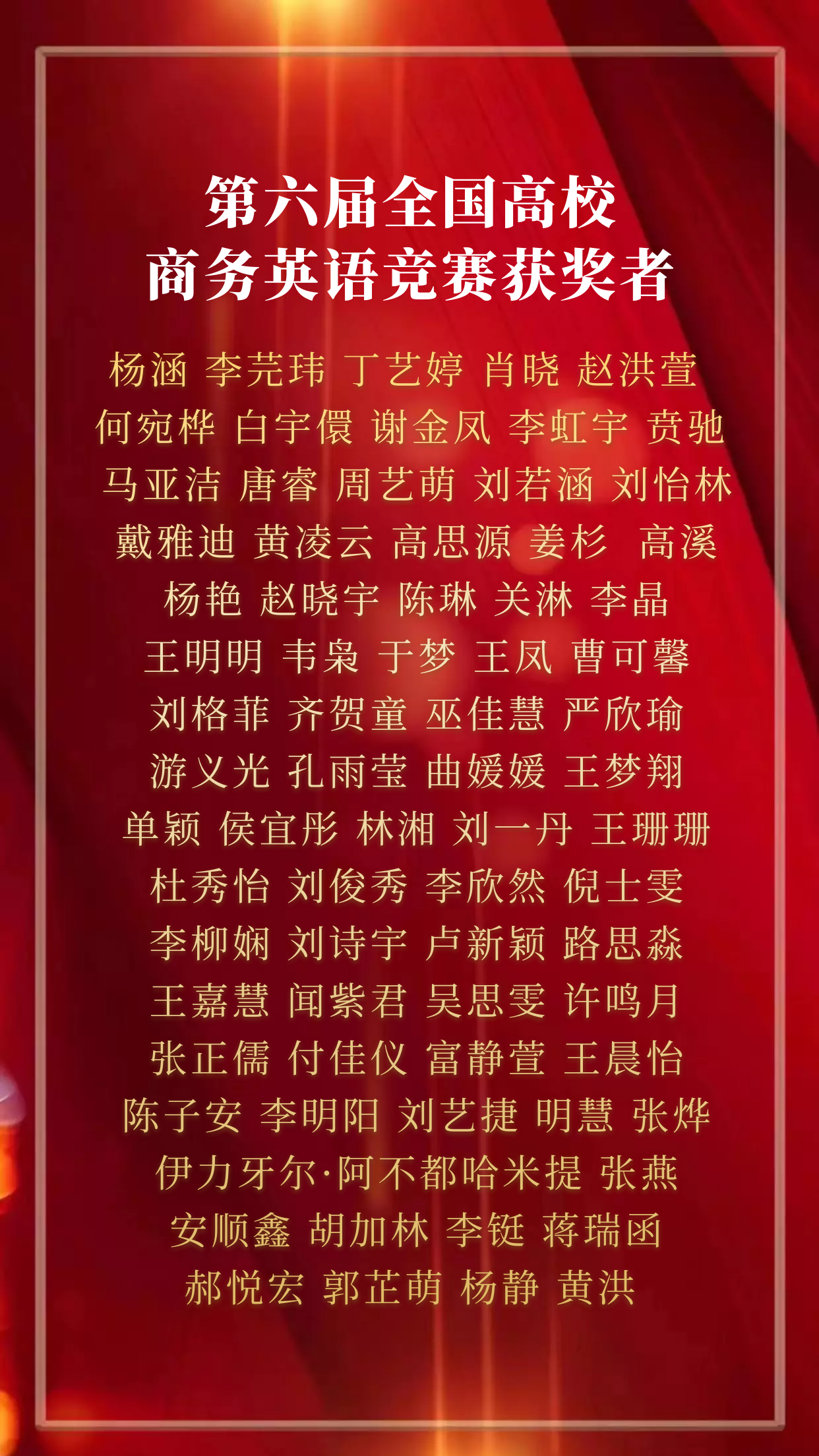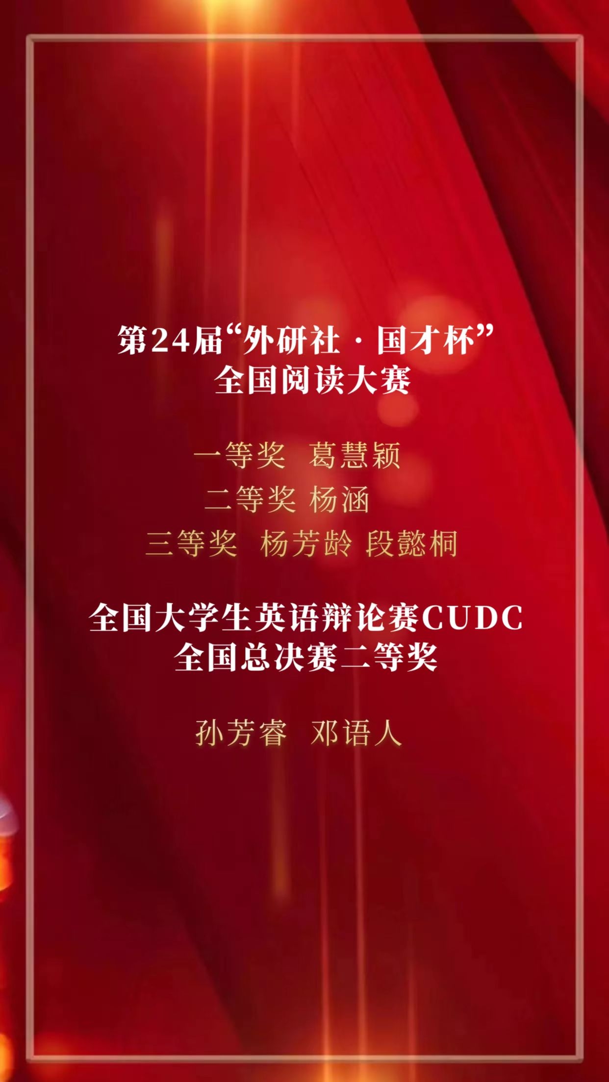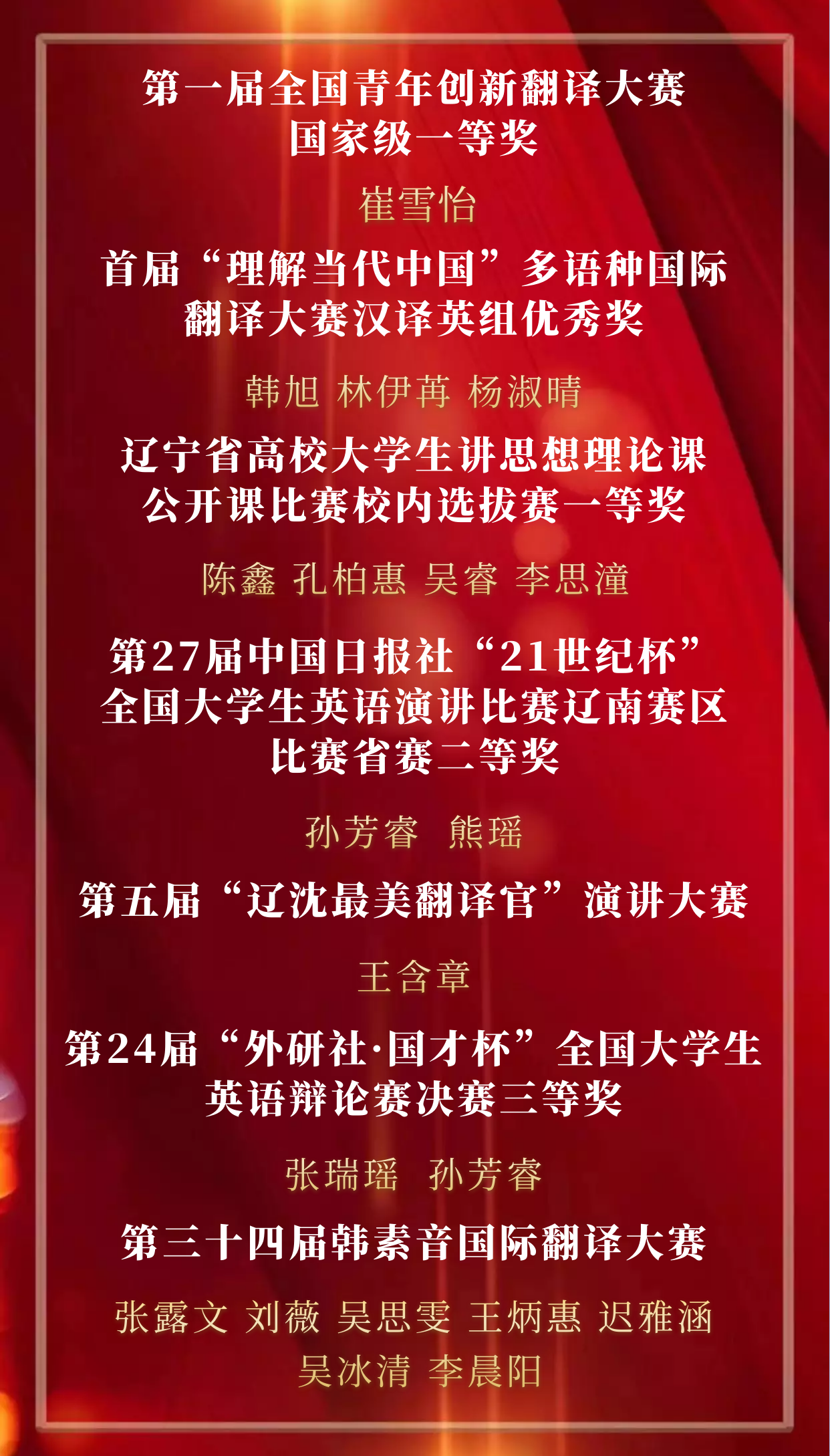 2022年英语学院“青春榜样,荣耀英院”云颁奖典礼至此告一段落,让我们向上述获奖同学致以最诚挚的祝贺!韶华如驶,时光如掷,2022年即将结束,是同学们的孜孜不倦、刻苦奋斗,以及老师们的耐心教授、悉心指导才使他们能够获得这些荣誉。含英咀华,妙语生花;文修励学,与英笃行。眼有星辰大海,心有繁花似锦。2023年,我们定会不负心中所爱,奔赴下一场山海。(况彦萱 陈玥凝)