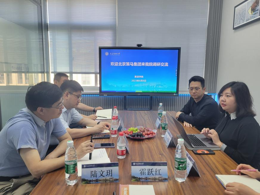 在讲座之前,英语学院领导班子和教师代表霍跃红教授、刘振华老师和陆文玥老师,在励业楼丹若沐和风工作室与北京策马集团总经理文毅和副总裁助理郭艳卿举行座谈。双方围绕学科专业建设、师资联培、校企合作、课程共建和英语专业翻译人才和商务英语专业人才培养等方面深入交流,重点对依托英语专业人才资源,开拓跨境电商和数字贸易就业市场进行了热烈探讨。
