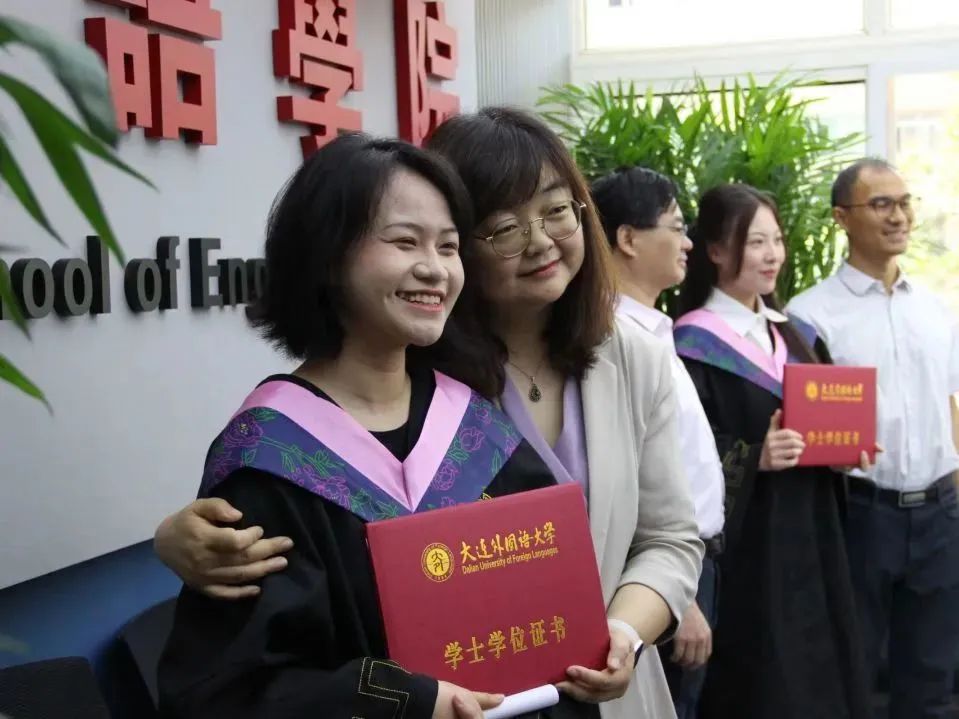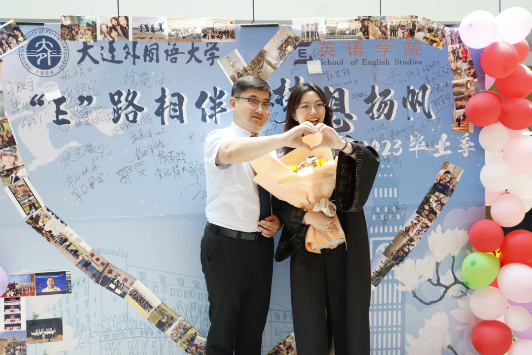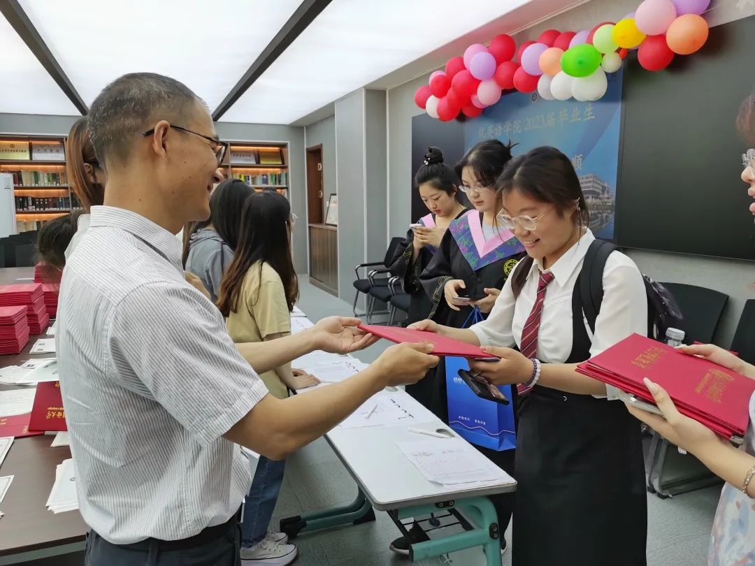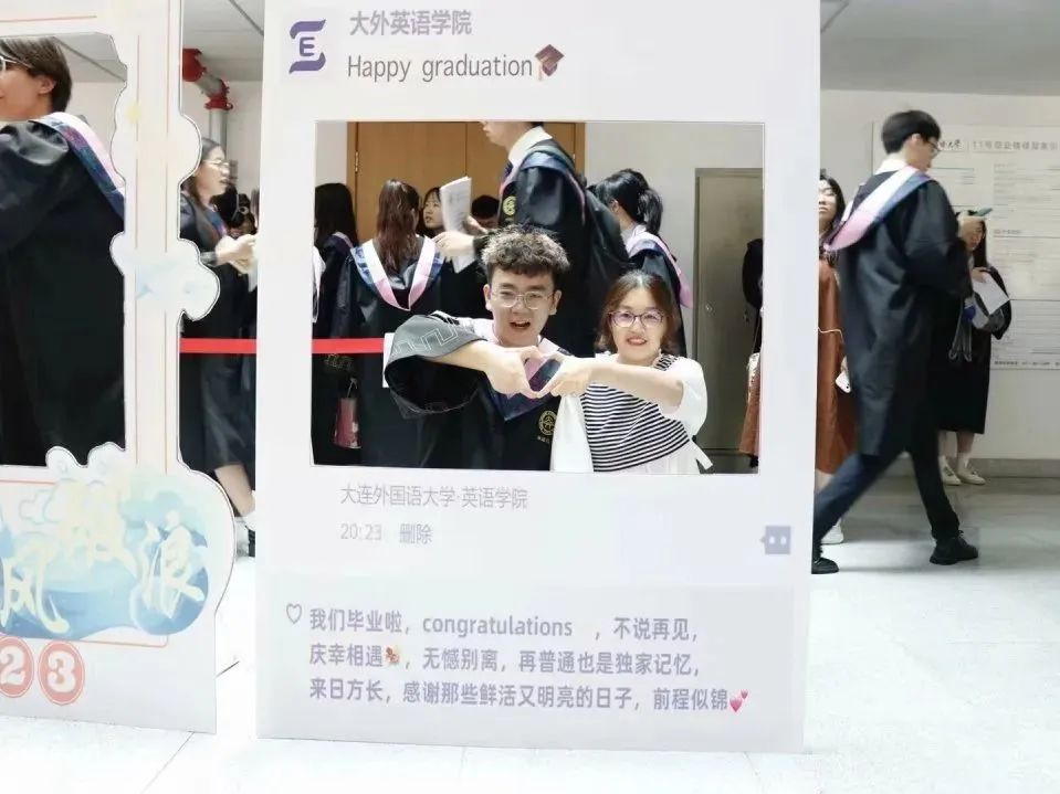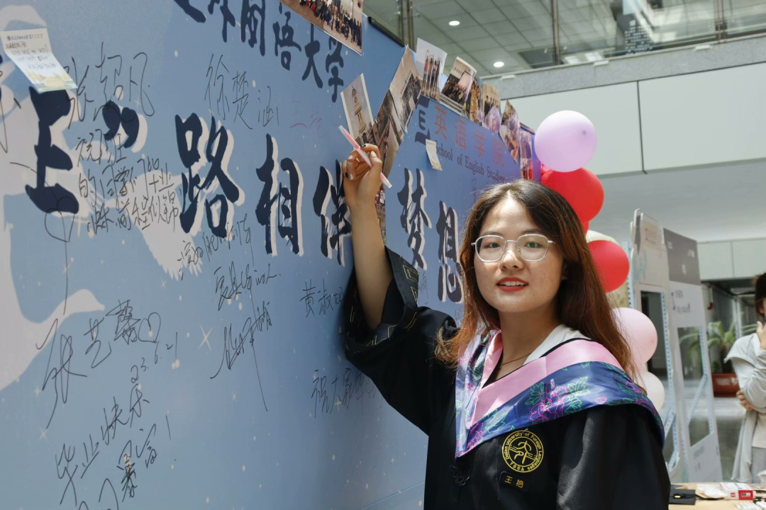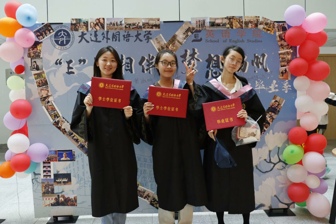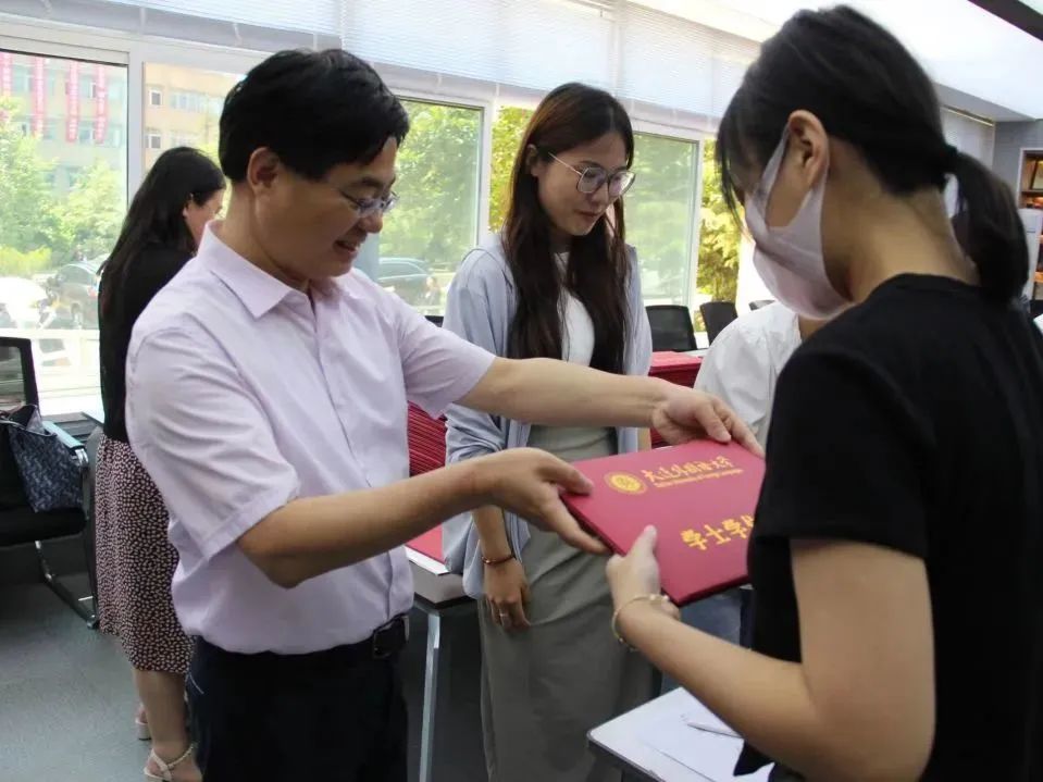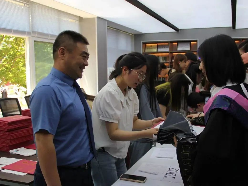 6月21日,英语学院为即将奔向五湖四海的学长学姐们颁发学位证、毕业证和辅修证书。在此期间,英语学院院长吕春媚、党委梁若冰副书记、党委副书记兼纪委书记孙硕、副院长曲涛、副院长刘晓晖、副院长王成东、硕士研究生导师孙鑫教授、王卉教授、2023届毕业生辅导员曲镜达及吴曼各位老师莅临现场前往祝贺,并与毕业生们拍照留念。看着曾经熟悉的面庞,老师和同学们纷纷湿了眼眶,感慨时光如梭。同学们在留言板上签下名字,似是为那段悄然而逝的时光画上最后的句号。