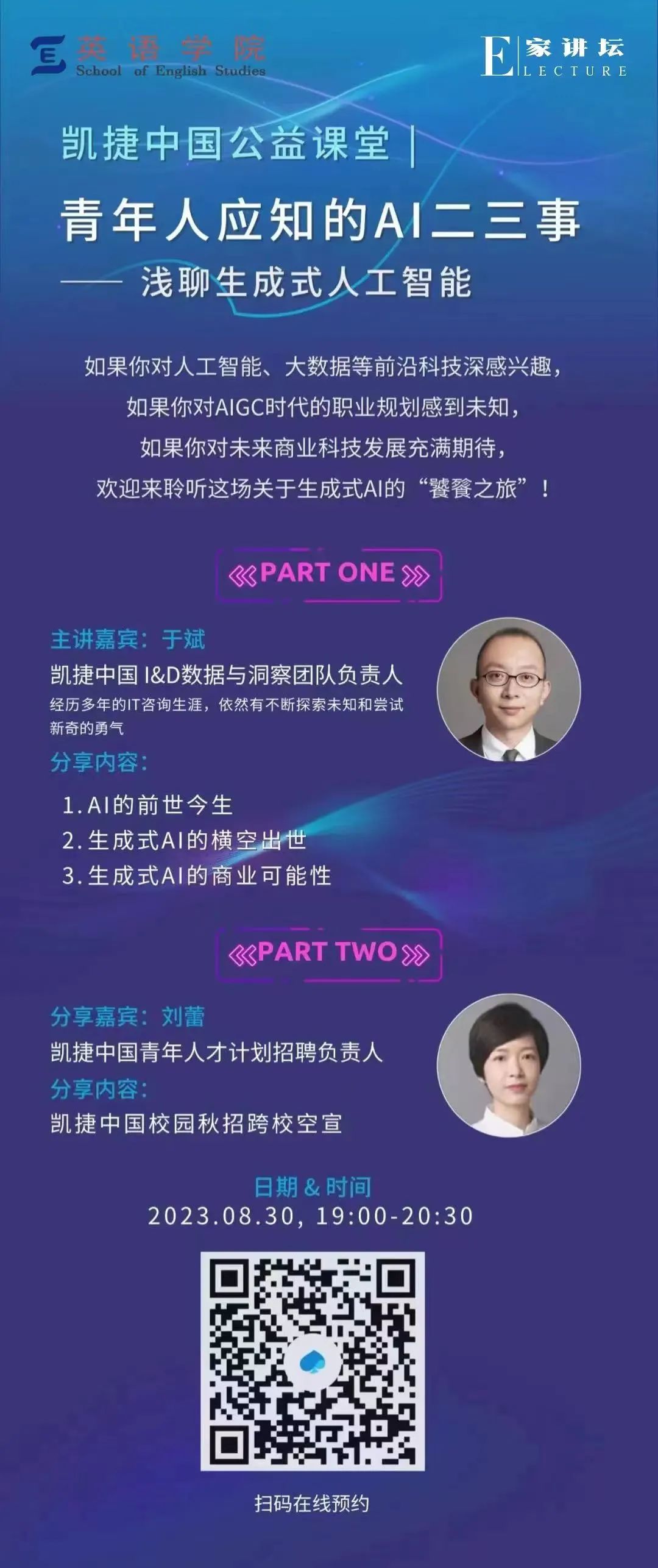 本次讲座主题为“浅聊生成式AI”,将于8月30日晚上19:00进行线上直播。讲座参与者不限年级专业,讲座后将进行22-24届学生的校招岗位的空宣,欢迎大家积极听讲!