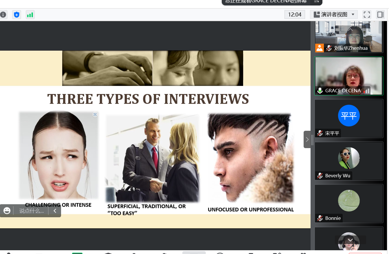 菲律宾De Carita商务咨询公司总经理Grace Monis Decena女士走进《国际商务谈判》课堂,结合丰富的工作经历和典型案例,为同学们讲授了“跨国公司的面试技巧”。本次专题讲座理论联系实践,重点围绕“挑战与紧张”“肤浅、传统或简单化”“未明确目的或专业性差”三种面试问题类型展开,明晰了面试中可能面临的压力与挑战,并与同学们细致分享了应对问题与挑战的实用技巧。Grace女士的讲解条理清晰、生动形象、案例丰富、启发性强,为毕业面试的同学们提供了全面且实用的借鉴,也为同学们未来的职场生活提供了重要参考。