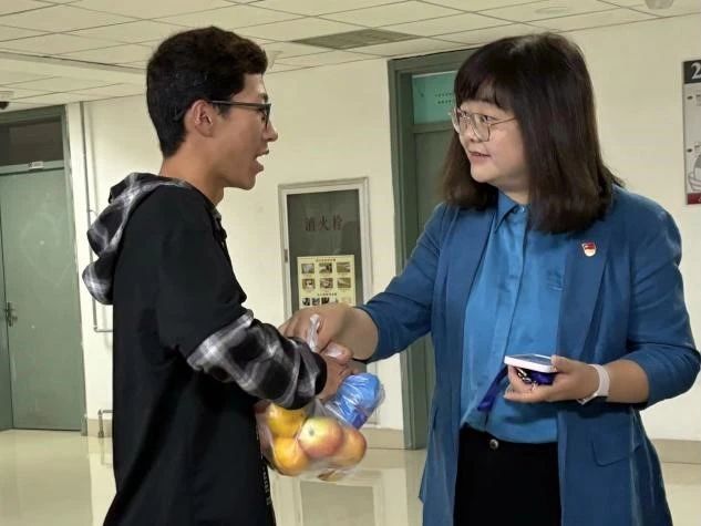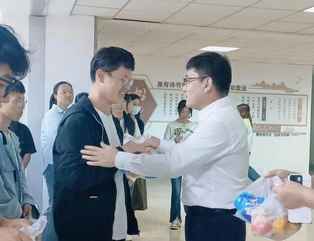 走访过程中,学院团委书记2023级辅导员曲镜达主持慰问活动,询问了在场2023级英院新生开学以来的生活状况,为同学们提出了学习、生活等方面的建议。接下来,梁若冰副书记表达了自己对新生的关怀,希望同学们在今后也能热心地帮助其他需要帮助的同学,并祝福同学们度过一段美好而充实的大学时光。最后,英语学院领导教师分发了节日慰问品,为同学们送上了中秋节和国庆节的“双节”祝福,并与同学们合影留念。