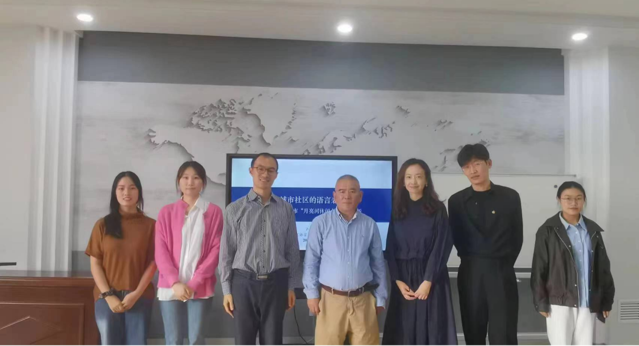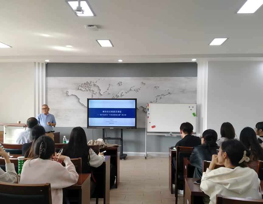 10月9日,北京语言大学卢德平教授应我校学科发展规划处和英语学院邀请,为我院师生做了题为“城市社区的语言表征——基于北京市‘月亮河休闲小镇’的分析”的学术讲座。讲座由学院副院长王成东主持,符号学团队部分教师、硕士研究生共同聆听了此次讲座。