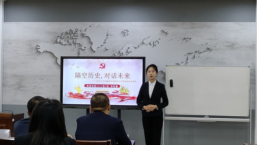 2022级5班李昕睿同学以“开辟马克思主义中国化时代化新境界”为题进行宣讲。只有把马克思主义基本原理同中国具体实际相结合,坚持运用辩证唯物主义和历史唯物主义,才能正确回答时代和实践提出的重大问题。
