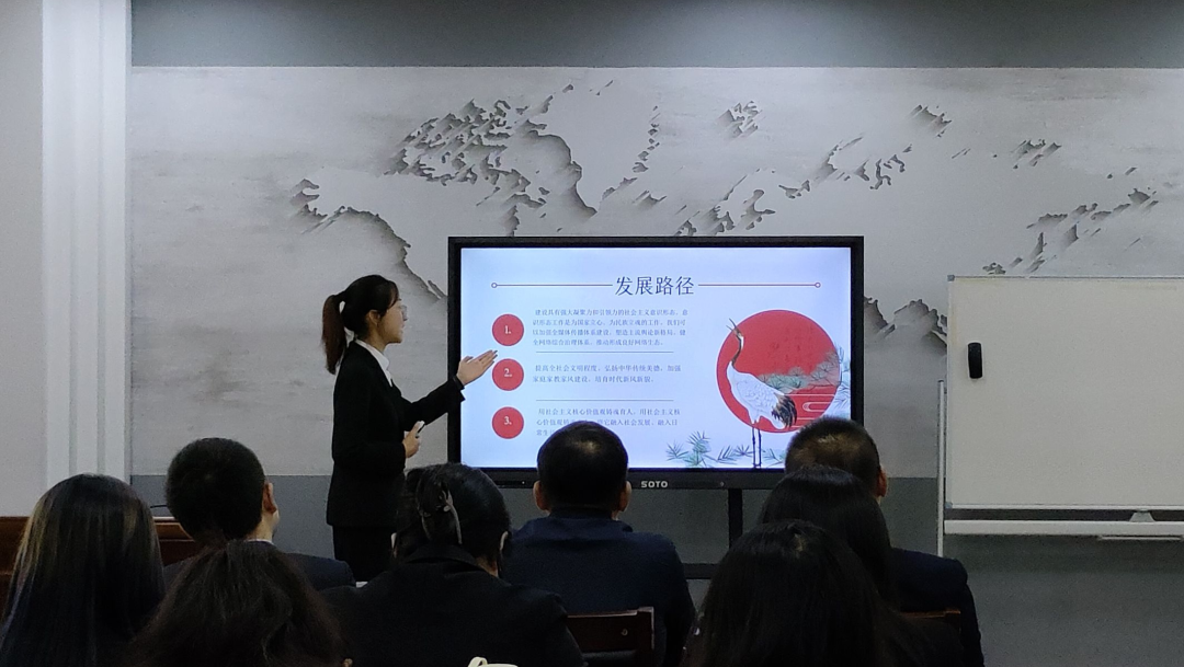 在本次宣讲中,六名选手以蓬勃向上的精神面貌依次上台。2022级3班丛楚涵同学聚焦“推进文化自信自强,铸就社会主义文化新辉煌”。传承和弘扬中华优秀传统文化、培育社会主义核心价值观对增强国家的文化自信和文化软实力、建设社会主义文化强国具有重要意义。