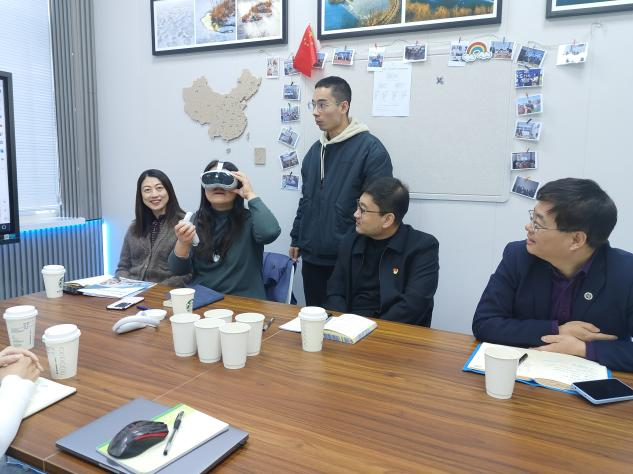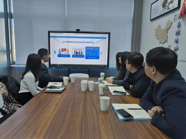 陈志能经理对我院提出的建议和合作模式表示认同,也特别期待与我院在平台建设、教材建设、课程思政教学改革、实习实训等方面广泛展开合作。除此之外,通过软件展示和现场体验的方式,工程师李明详细介绍了《英语演讲》虚拟仿真实训平台。该平台不仅在内容上贴合国家政策和学生需求,并且具备完善的知识评价体系,对于课程思政内容与教学内容的有机融合。用VR复原国家特色展馆是本平台的一大亮点,学生能够通过VR在一带一路科普馆、航天发射场等身临其境地学习。