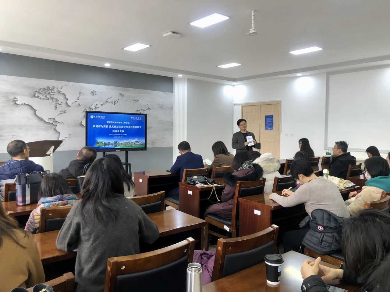 12月13日下午,英语学院在爱尔兰研究中心召开本学期本科教学工作会议,主题为“以迎评为契机,扎实推进英语学院本科教育教学高质量发展”。会议由副院长曲涛主持,英语学院全体教师参加。