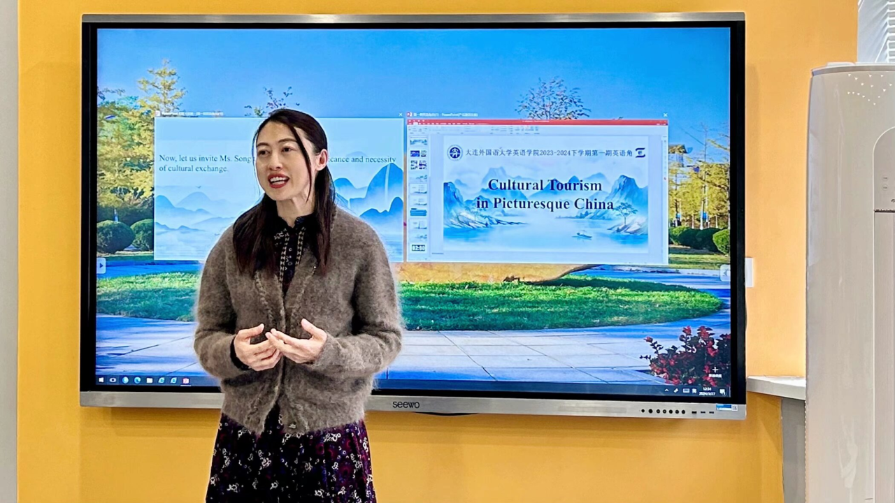 3月27日,英语学院本学期第一期英语角于VR实训中心顺利举办。本期英语角以"Cultural Tourism in Picturesque China"为主题,由2023级学生陈奕如和尹赫威主持,并邀请宋平平老师与同学们一道体悟文化魅力与人文温度,开启美妙的文化之旅。
