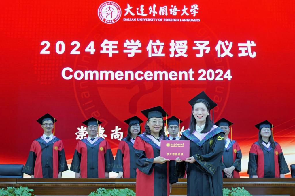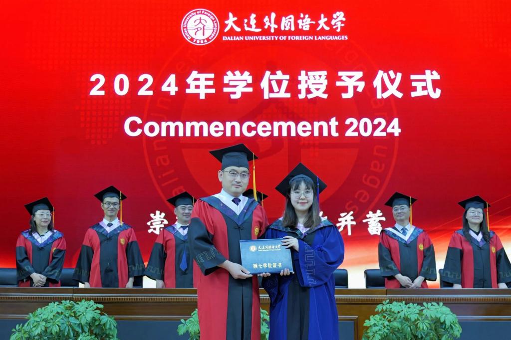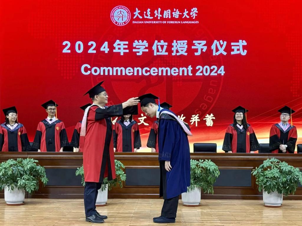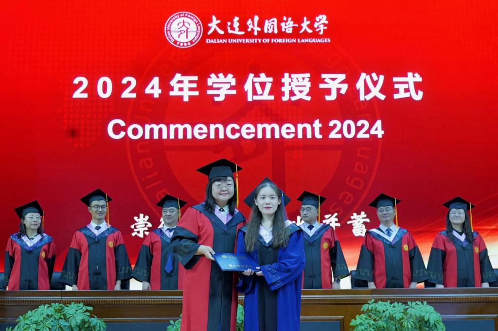 灼灼韶华,风禾尽起。6月17日下午,大连外国语大学英语学院学位授予仪式在大学生活动中心成功举办。英语学院党委书记梁若冰、院长吕春媚、党委副书记兼纪委书记孙硕、副院长曲涛、副院长刘晓晖、副院长王成东、团委书记曲镜达、研究生导师孙鑫教授、2024届毕业生辅导员王艺凝、研究生辅导员黄新智以及全体毕业生出席本次仪式。