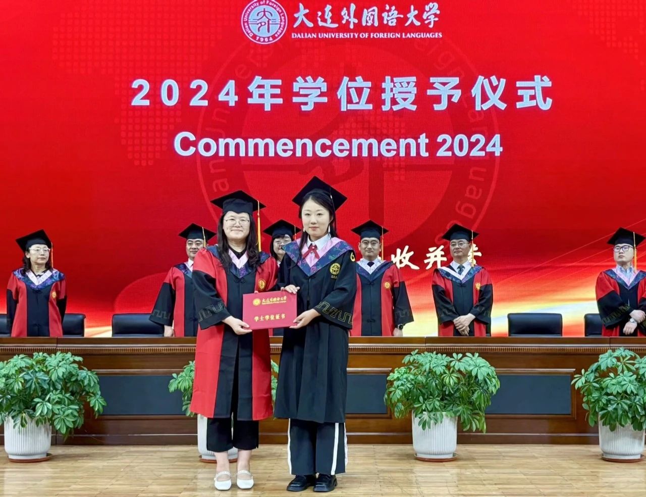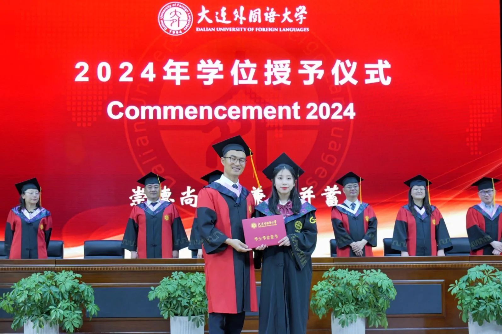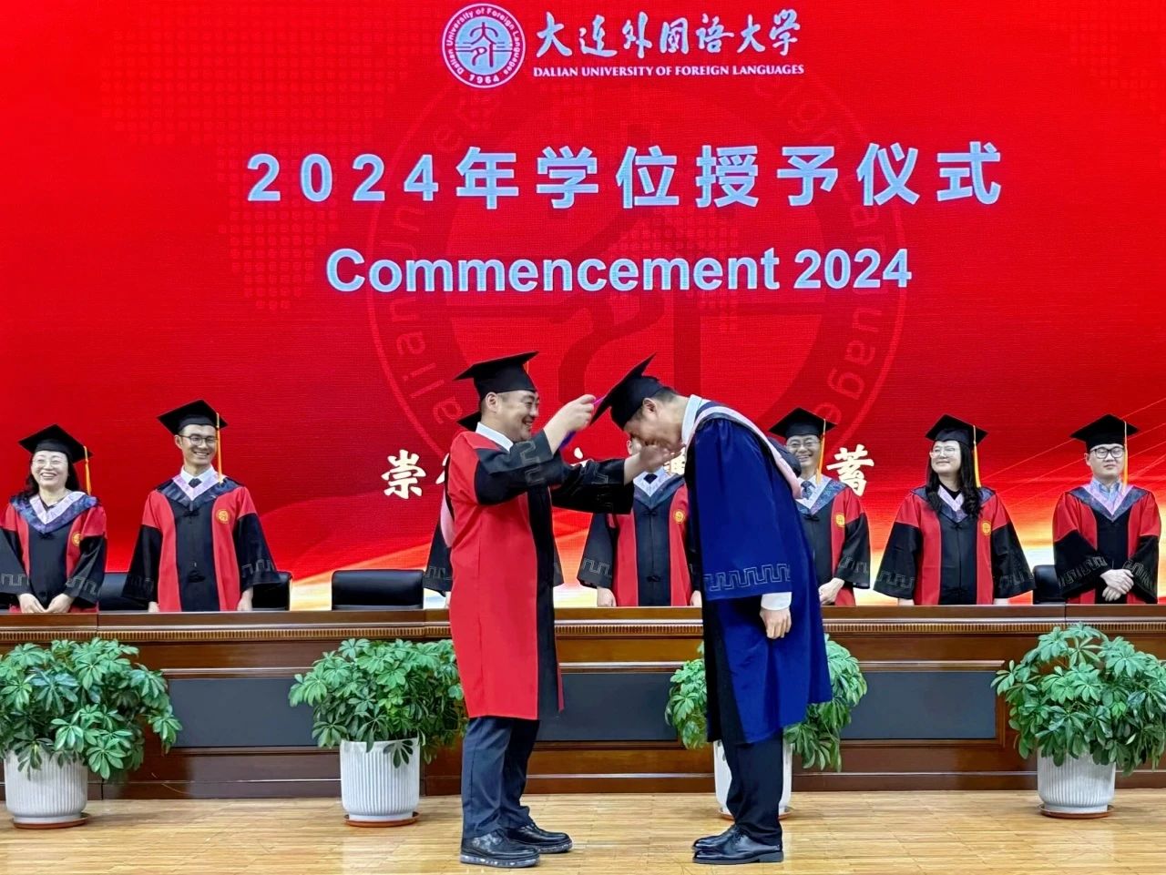 灼灼韶华,风禾尽起。6月17日下午,大连外国语大学英语学院学位授予仪式在大学生活动中心成功举办。英语学院党委书记梁若冰、院长吕春媚、党委副书记兼纪委书记孙硕、副院长曲涛、副院长刘晓晖、副院长王成东、团委书记曲镜达、研究生导师孙鑫教授、2024届毕业生辅导员王艺凝、研究生辅导员黄新智以及全体毕业生出席本次仪式。