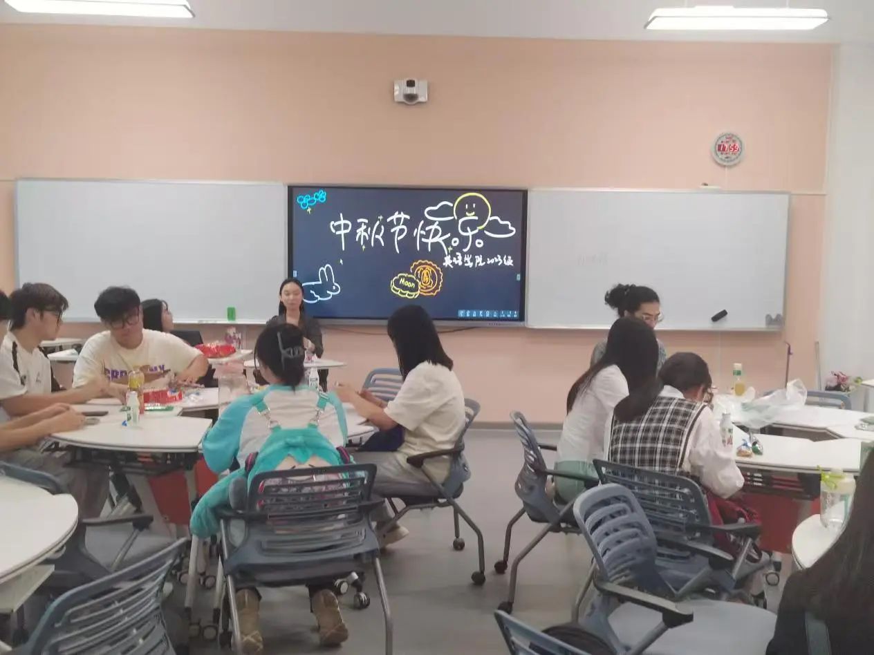 英语学院2023级本科生于励业楼举办了“月满中秋,情聚英院”主题晚会。在晚会中,“猜灯谜”“中秋知识竞答”等一系列游戏环节和各种精美的小礼品极大地激发了同学们的热情,不仅让大家在轻松愉快的氛围中学习到了更多关于中秋节的知识,也增进了同学之间的交流与了解。
