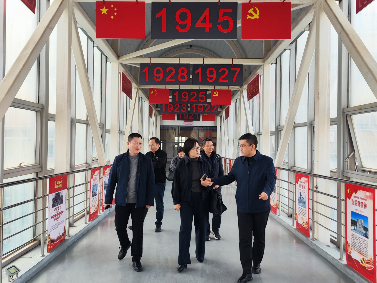 陈慧燕一行参观了新文科数字人文创新实验室和VR实训中心,对实验室设备配置及教学功能进行了深度考察。之后,参观了红色教育基地--党史长廊,共同分享党建经验。