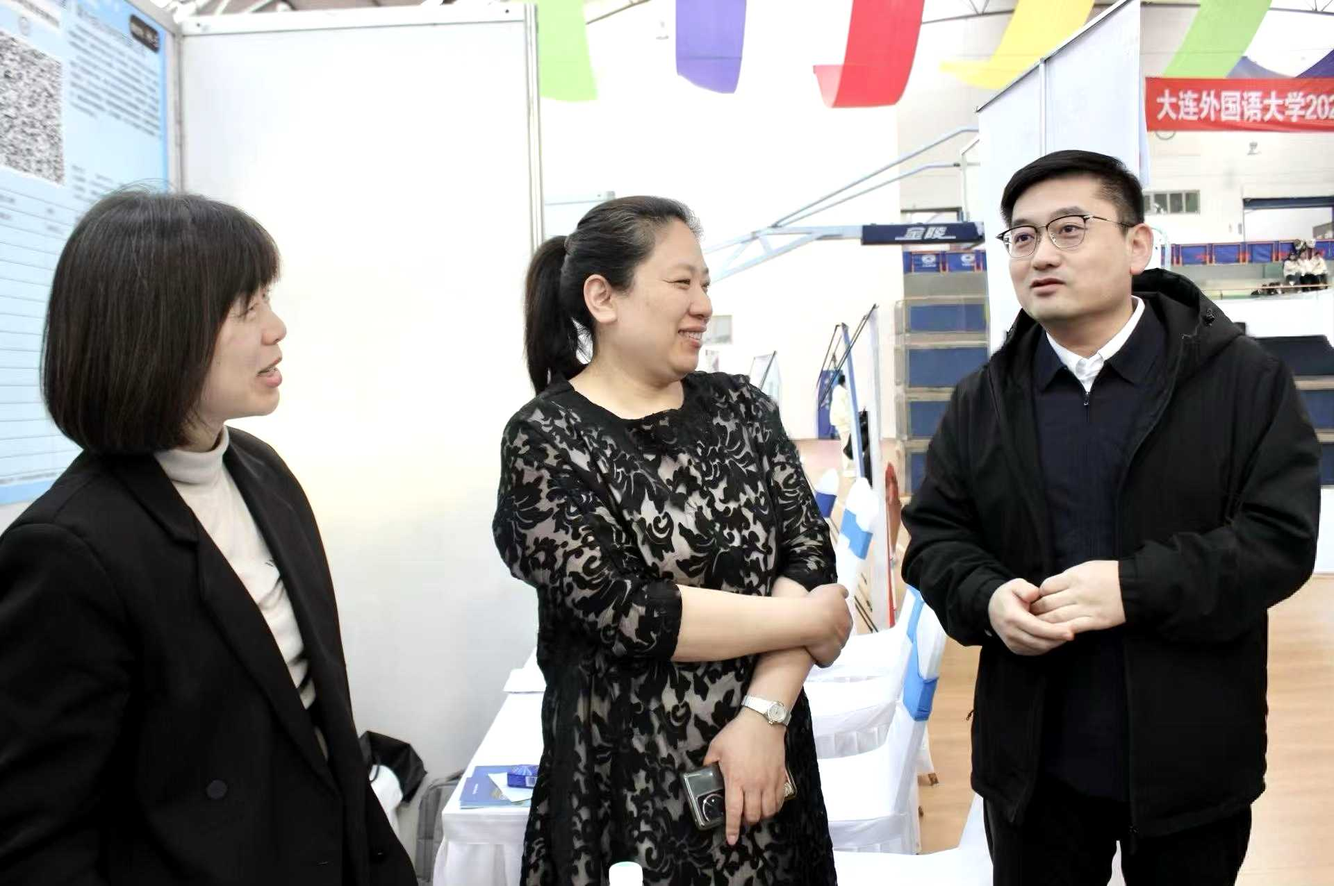 招聘会期间,学校党委书记王伟辰、校长丛明才一行到沈河区莱塔思教育培训中心招聘展台前,与英语学院2010届校友刁彤女士就相关专业招聘事宜与用人单位及求职学生进行深入交流。