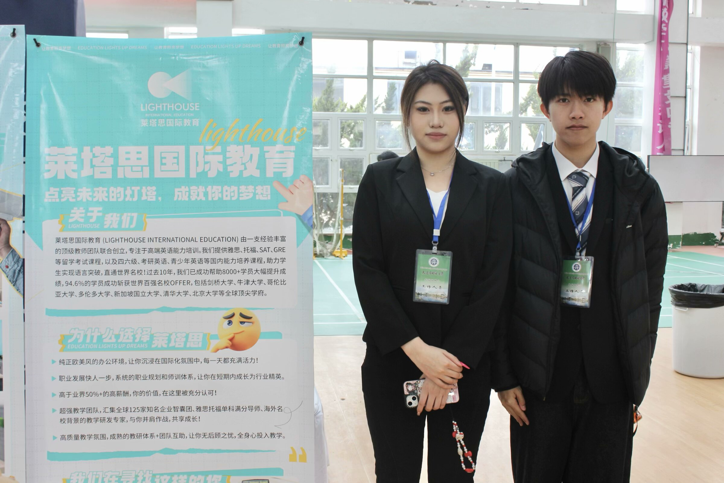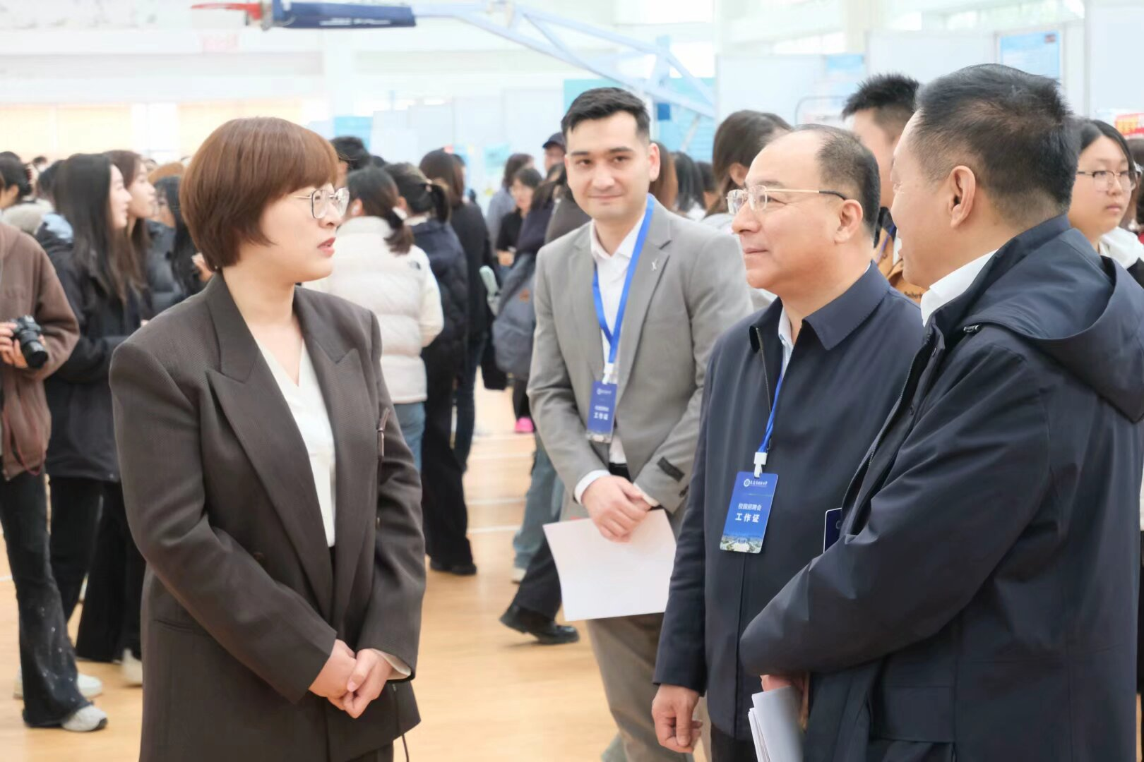 招聘会现场人头攒动、气氛热烈,来自各行各业的用人单位齐聚一堂,提供了丰富多样的岗位,涵盖了多个领域。英语学院志愿者们实时对接各企业负责人,动态跟进各用人单位行程,引导面试者有序面试,展现了英语学院认真负责、精益求精的精神风貌。