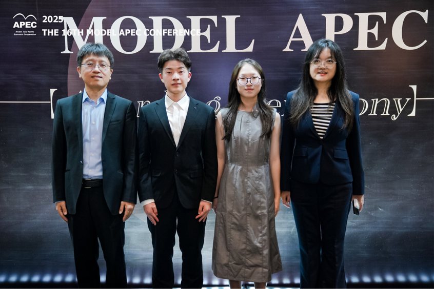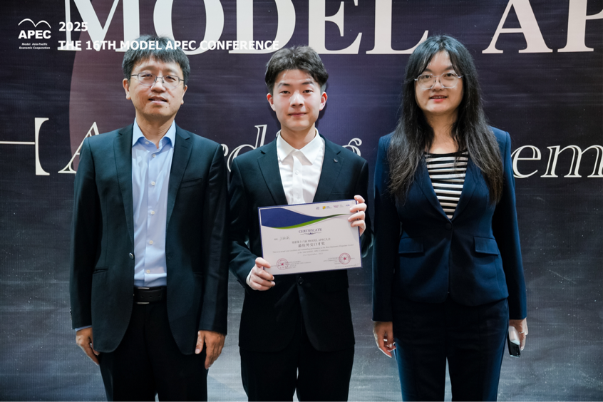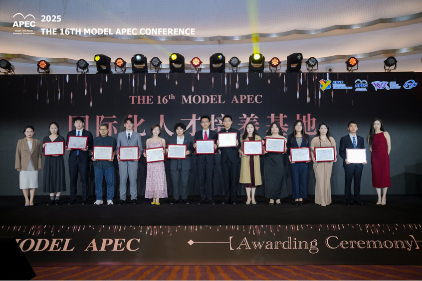 2025年9月20日至21日,第十六届亚太青年模拟APEC大会(16th MODEL APEC)全国总决赛在北京举行。本次大会参赛高校百余所,来自北京大学、清华大学、南京大学、北京外国语大学、上海外国语大学等多所高校的136名选手,展现出青年学子的能力与风采。经过前期的层层选拔,由英语学院教师李雪梅和刘翔指导的尹赫威和夏园梦代表学校参加了此次总决赛。两位学生在平行会议中表现出色,取得了优异成绩。尹赫威经过地区赛、全国赛两轮竞技,最终获得全国大会最佳外交口才奖;夏园梦获得全国大会优秀奖。同时大连外国语大学荣获“国际化人才培养基地”称号。
