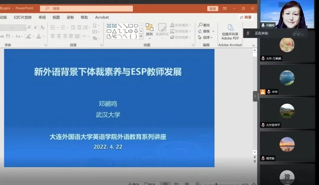 4月22日,武汉大学邓鹂鸣教授应我校科研处、英语学院外语教育研究中心和外语教育研究基地的邀请,通过腾讯会议平台为我院师生做了题为“新外语背景下体裁素养与ESP教师发展”的学术讲座。本次讲座由科研处泰中华副处长主持,我校部分教师、硕士研究生共同聆听了此次讲座。