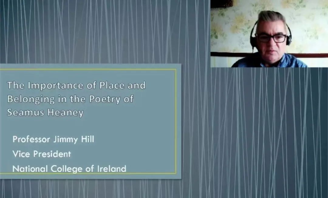 10月25日,爱尔兰国家学院Jimmy Hill教授应我校科研处和英语学院邀请,通过腾讯会议平台为我院师生做了题为“The Importance of Place and Belonging in the Poetry of Seamus Heaney”的学术讲座。本次讲座为我院“外语学科融合发展”高端云讲坛系列讲座之一,由英语学院副院长王成东主持,我院部分教师、硕士研究生及英语语言文学方向本科生共同聆听了此次讲座。