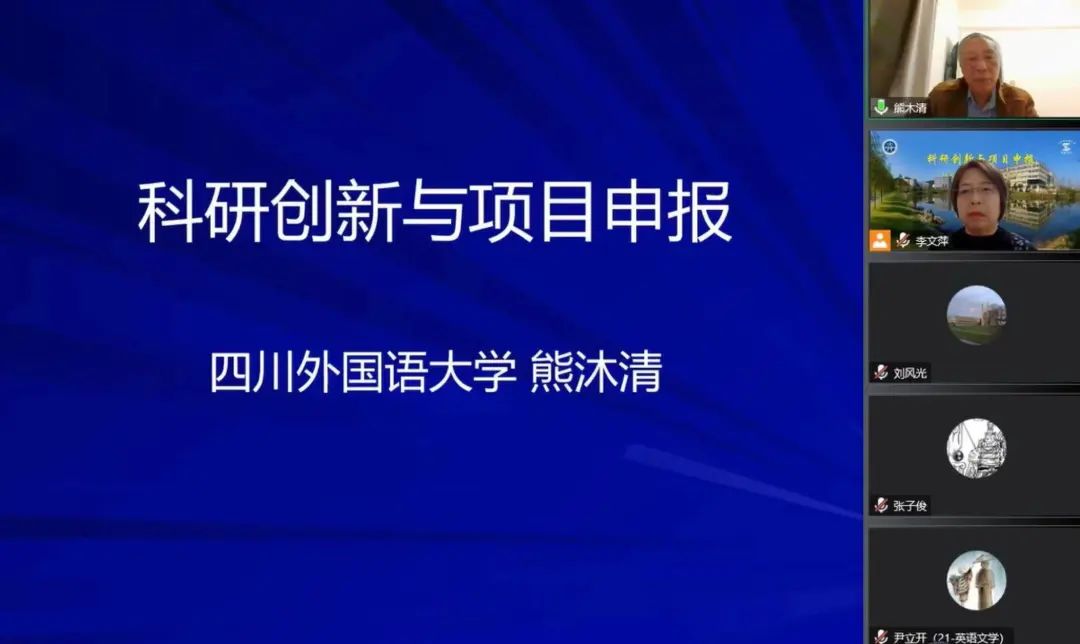 10月27日,四川外国语大学熊木清教授应我校科研处和英语学院邀请,通过腾讯会议平台为我院师生做了题为“科研创新与项目申报”的学术讲座。本次讲座为我院“外语学科融合发展”高端云讲坛系列讲座之一,由英语学院李文萍教授主持,我校科研处处长刘风光教授、部分教师及硕士研究生共同聆听了此次讲座。