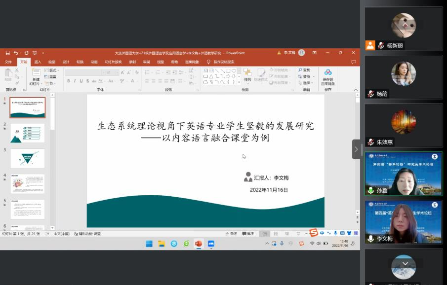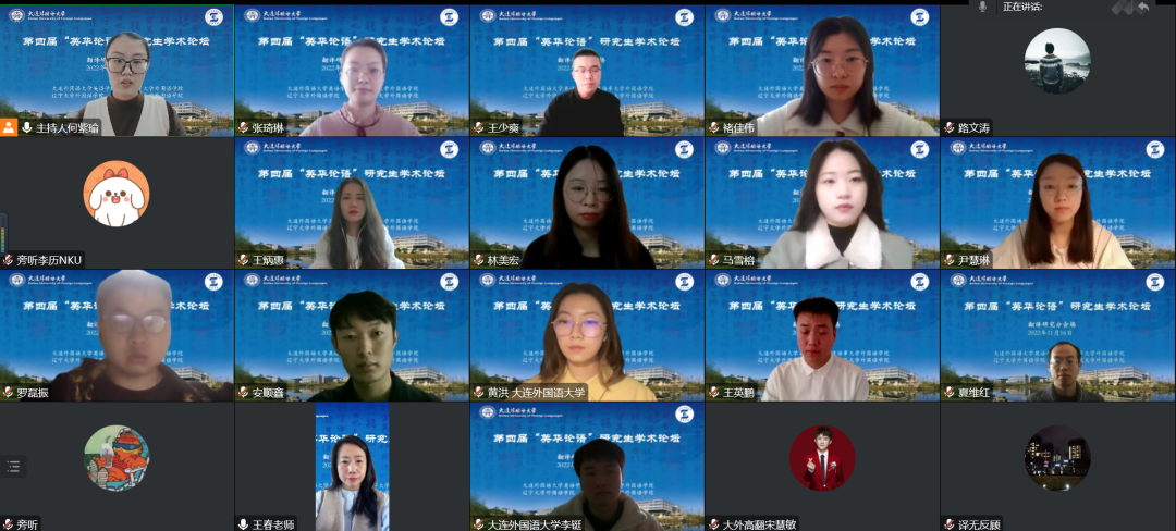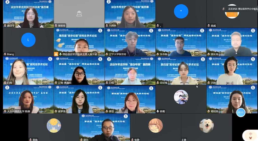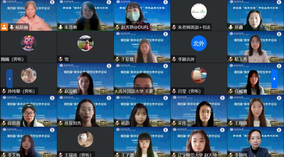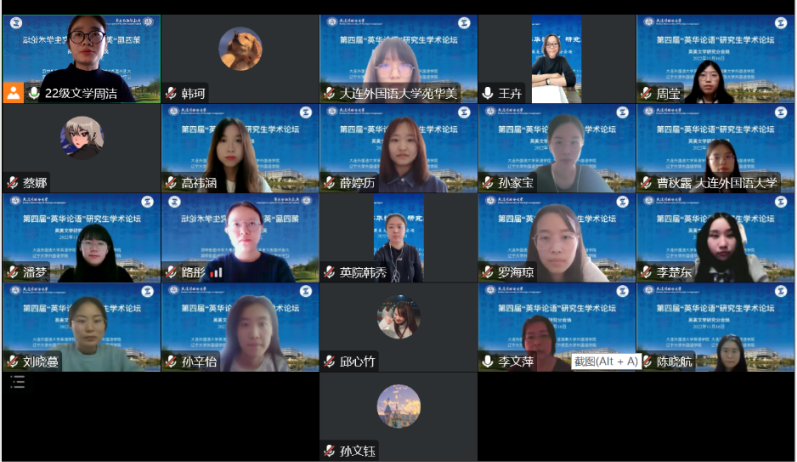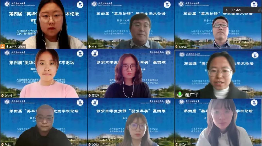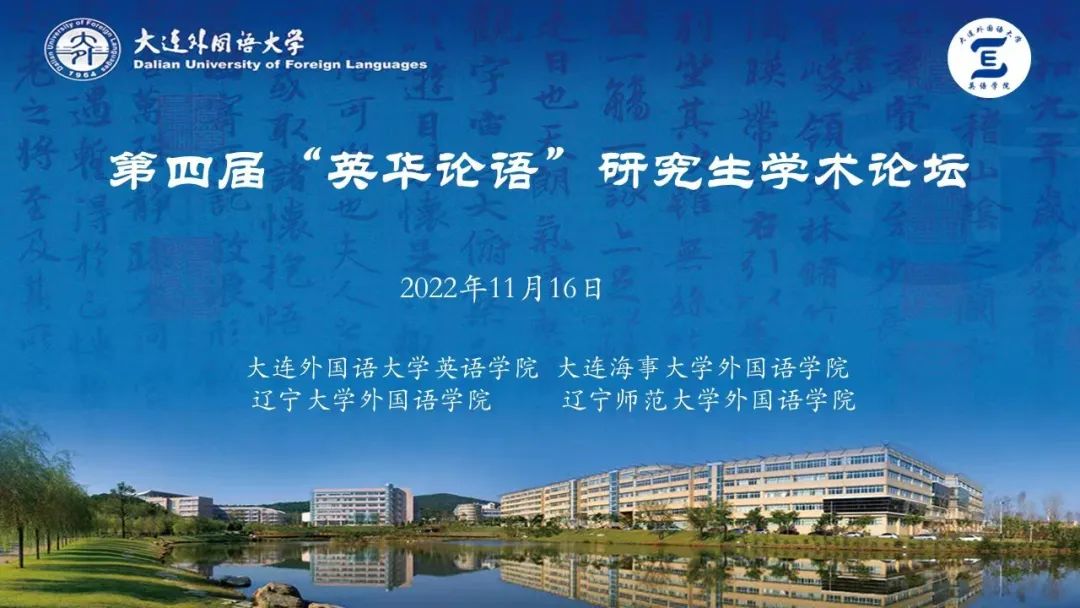 11月16日下午,第四届“英华论语”研究生学术创新论坛在大连外国语大学成功举办。本次论坛由大连外国语大学英语学院、大连海事大学外国语学院、辽宁大学外国语学院、辽宁师范大学外国语学院联合举办,旨在为研究生搭建高质量学术交流平台,紧跟国家战略,响应时代需求,突出思想性、科学性、交叉性与创新性,着力培养高层次创新型青年人才,为建设社会主义现代化强国提供有力的人才支撑。本次论坛采用线上模式进行,下设理论语言学研究、翻译研究、政治文本翻译研究、英美文学研究、数字人文研究、外语教学研究六个分论坛。