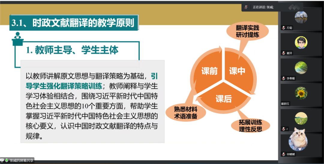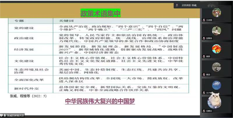 首先,张威教授指出,在中国发展新时代背景下,必须加强外语课程中的思政教育,要秉持课程融合学习、能力导向的教学理念,培养更多有家国情怀、有全球视野、有专业本领的复合型人才,以此更好地服务国家战略需求,助力中国更好地走向世界。接下来,张威教授详细分析了时政文献翻译的四项教学原则:既要以学生为主体,又要强调教师主导;要突出汉英基础知识学习,强化汉英时政文献语言特色对比;要以我为主、融通中外,灵活应用多样化翻译策略;要以实践为本、思辨为要,引导学生理性分析中国时政文献翻译与传播的实践。最后,张威教授从教师的角度提出了六点教学建议:要提高学生政治理论素养;要帮助学生理解当代中国;要强化中外时政文献的语言特点对比教学;要突出国际传播,培养高素质的翻译与国际传播专门人才;要丰富教学方法,充分应用启发式、研讨式教学方法;最后还要运用好教学用书。讲座结束后,张威教授与导师们进行了交流互动,解答了老师们提出的问题。