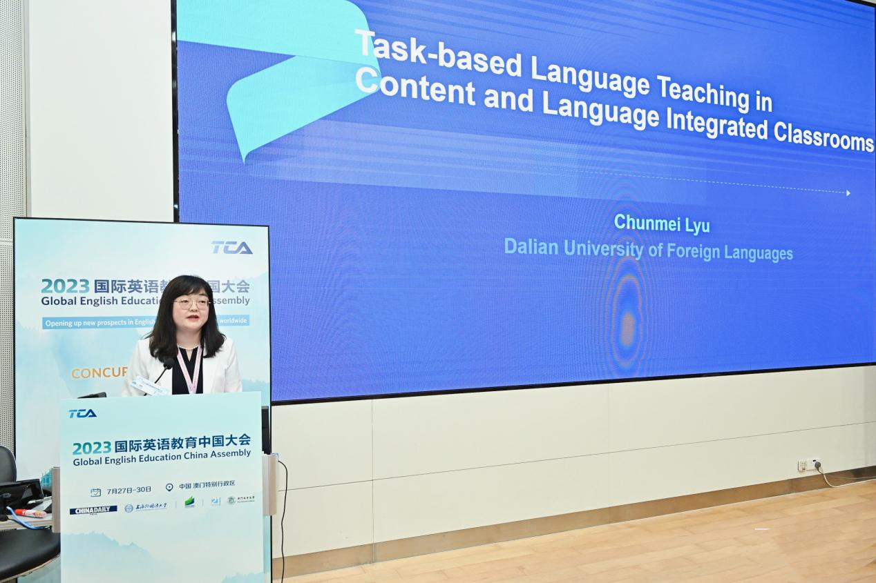 7月28日下午,常俊跃教授主持了2023国际英语教育中国大会“内容语言融合课程体系的建构与实践”专题研讨,并以“从语言导向培训到内容语言融合教育——外语教育理念的变革”为主题进行了发言。常教授以大连外国语大学英语专业为例,介绍了内容语言融合教育理念(CLI)的内涵及其实践效果。夏洋教授以“内容语言融合课程教师教学能力发展研究”为主题进行了专题发言,基于对内容语言融合课程教师开展的实证研究,分享了中国外语教育环境下内容语言融合课程教师教学能力的构成及教学能力发展路径。吕春媚教授进行了题为“内容语言融合课程的任务型教学”的专题发言,以国家级一流本科课程《跨文化交际》为例,介绍了内容语言融合教学理念与任务型语言教学相结合的教学模式。