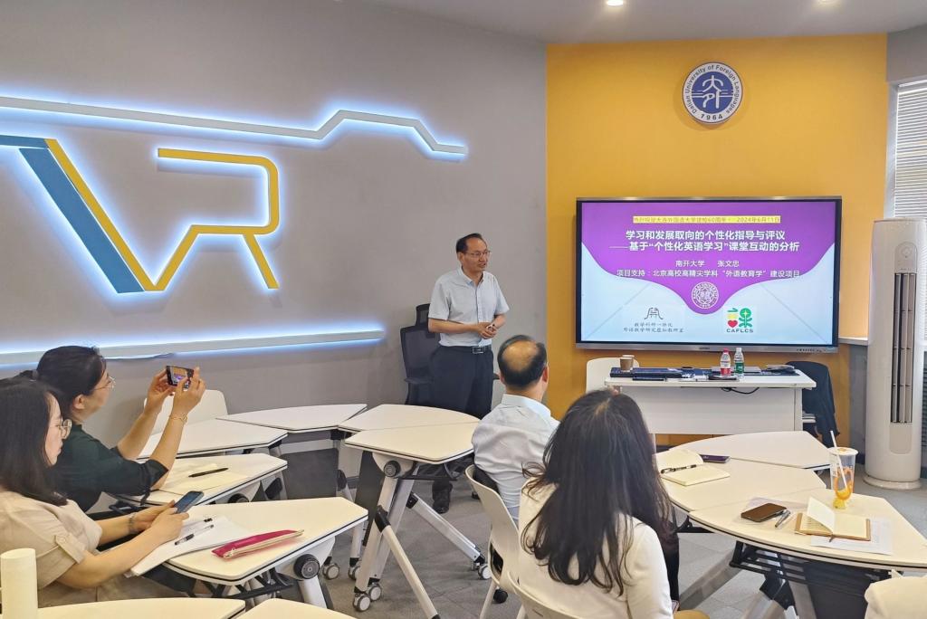 6月11日,南开大学外国语学院教授、南开大学和中国海洋大学双聘博士生导师张文忠应我校科研处和英语学院邀请,为我院师生做了题为“学习和发展取间的个性化指导与评议——基于‘个性化英语学习’课堂互动的分析”的学术讲座。本次讲座既是大连外国语大学建校60周年校庆系列学术讲座,同时也是我院辽宁省虚拟教研室建设点 英语专业虚拟教研室的一项集体教研活动,由外语教育研究中心副主任泰中华主持,大连外国语大学原副校长常俊跃、学院院长吕春媚、外语教育研究中心部分成员、教育方向研究生参加了此次讲座。