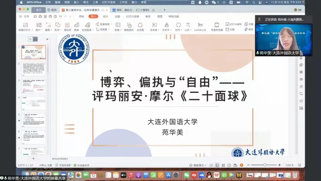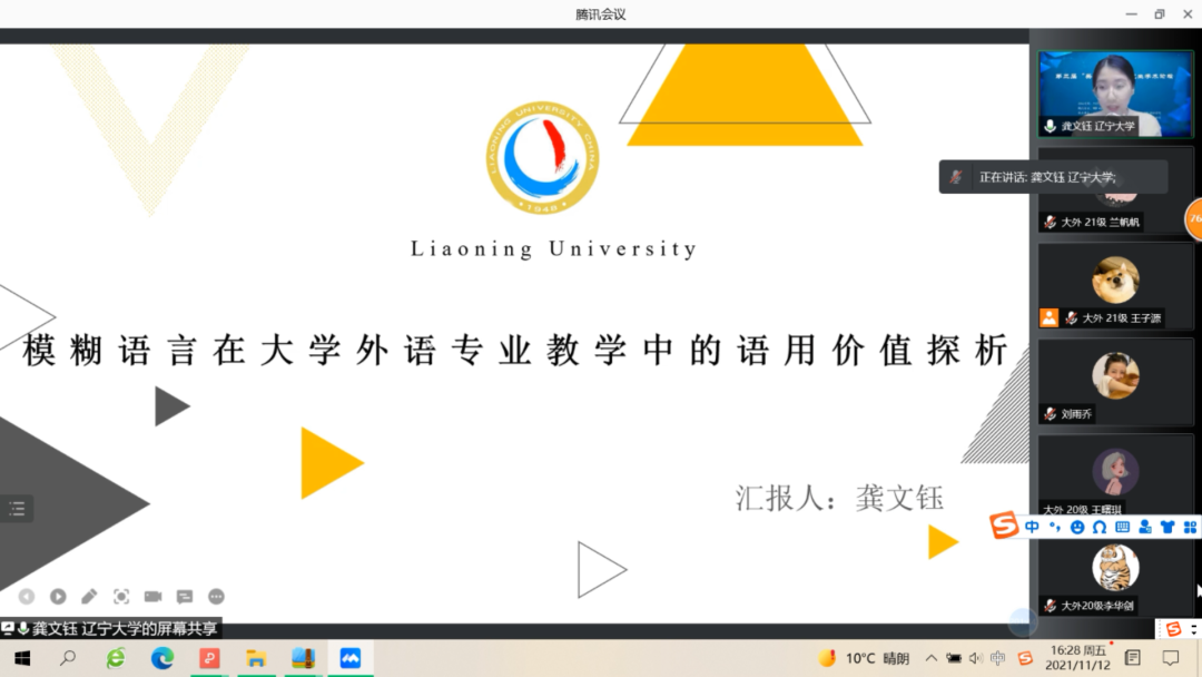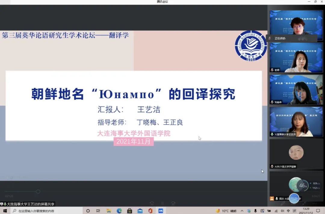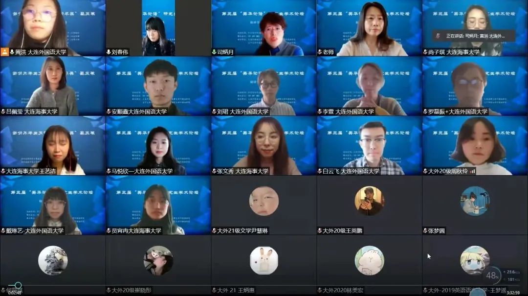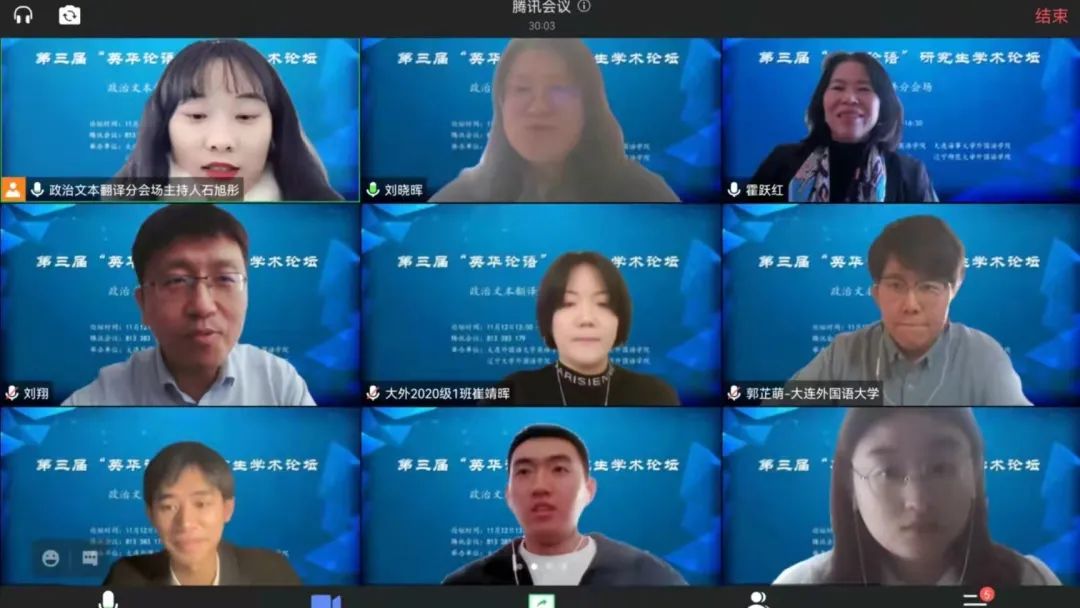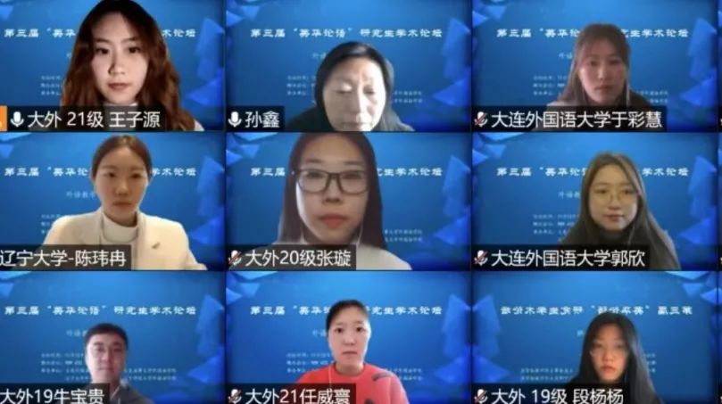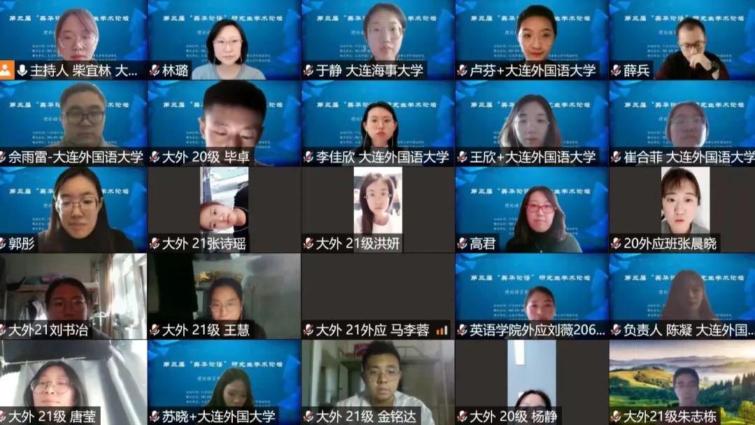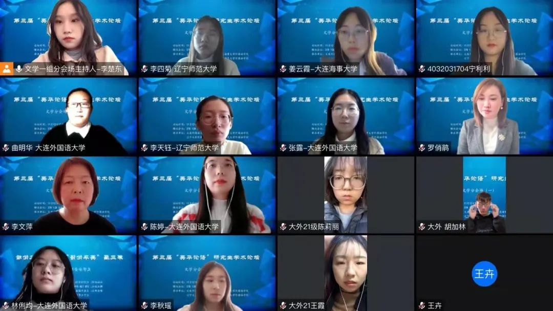 11月12日下午,大连外国语大学英语学院、大连海事大学外国语学院、辽宁大学外国语学院、辽宁师范大学外国语学院联合举办的第三届“英华论语”研究生学术论坛圆满结束。本次论坛旨在贯彻落实习近平总书记关于研究生教育工作的重要指示精神,提升研究生创新学术素养,增进校际间研究生学术交流与合作,力图为国家培养和储备高层次创新型人才。本次论坛采用线上模式进行,共设理论语言学、翻译学、政治文本翻译、文学(一)、文学(二)、外语教学六个分会场,吸引了来自四所院校100多名研究生的积极参与。经过专家评审,共有65名研究生进行了线上发言。
