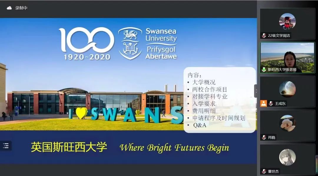 为进一步推进与国外友好院校的交流与合作,为学生提供优质的国际化教育平台,英语学院于11月9日邀请英国斯旺西大学北京代表处项目主管张蕾女士进行了留学项目线上宣讲会。此次宣讲会由学院副院长王成东主持,对留学项目感兴趣的本科生和研究生参加了此次宣讲会。
