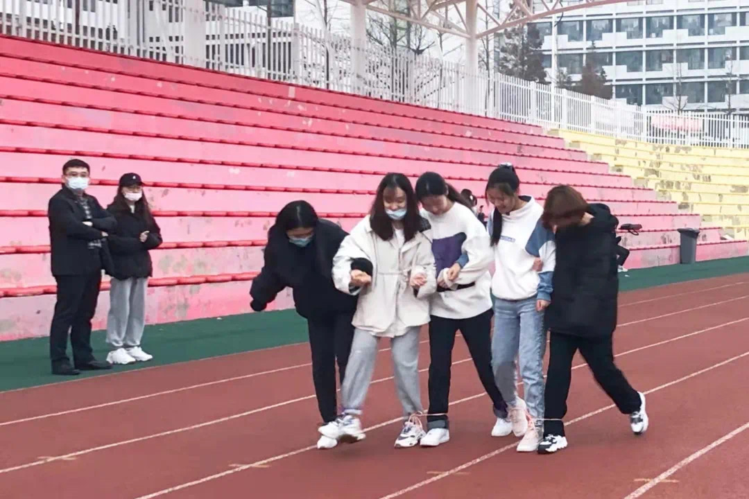 随着一声哨响,五位同学迈着稳健的步伐向终点迈进,齐头并进,携手前行。一根根绑绳,将每个人紧紧贴合在一起。在齐肩并步的过程中,互相磨合与鼓励,全力以赴,奔向终点!五人同心,在哨声响起的刹那,信任和理解便已经在彼此心头传递,赛出的不只是成绩,更是友谊,是心有灵犀;迈出的不仅是步伐,更是自信,是意气风发。