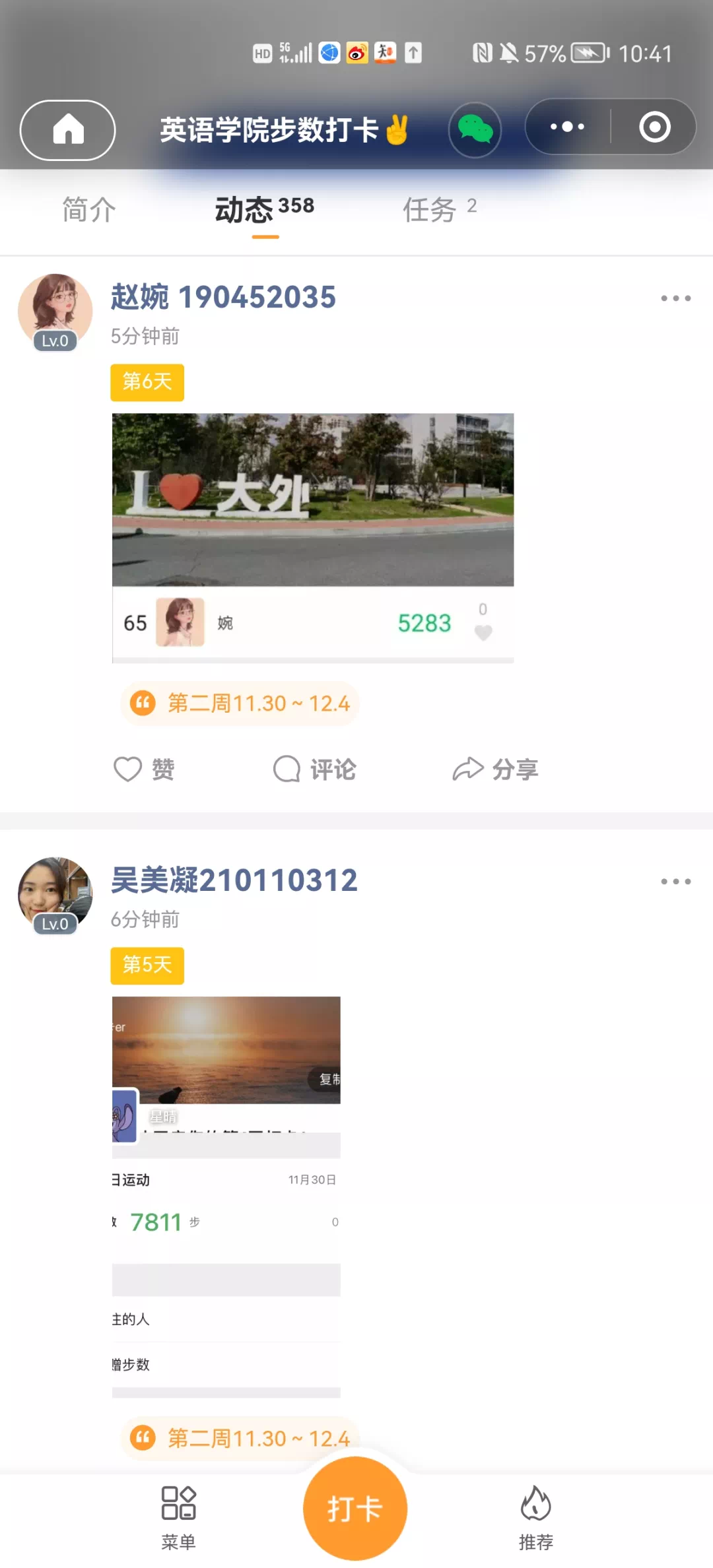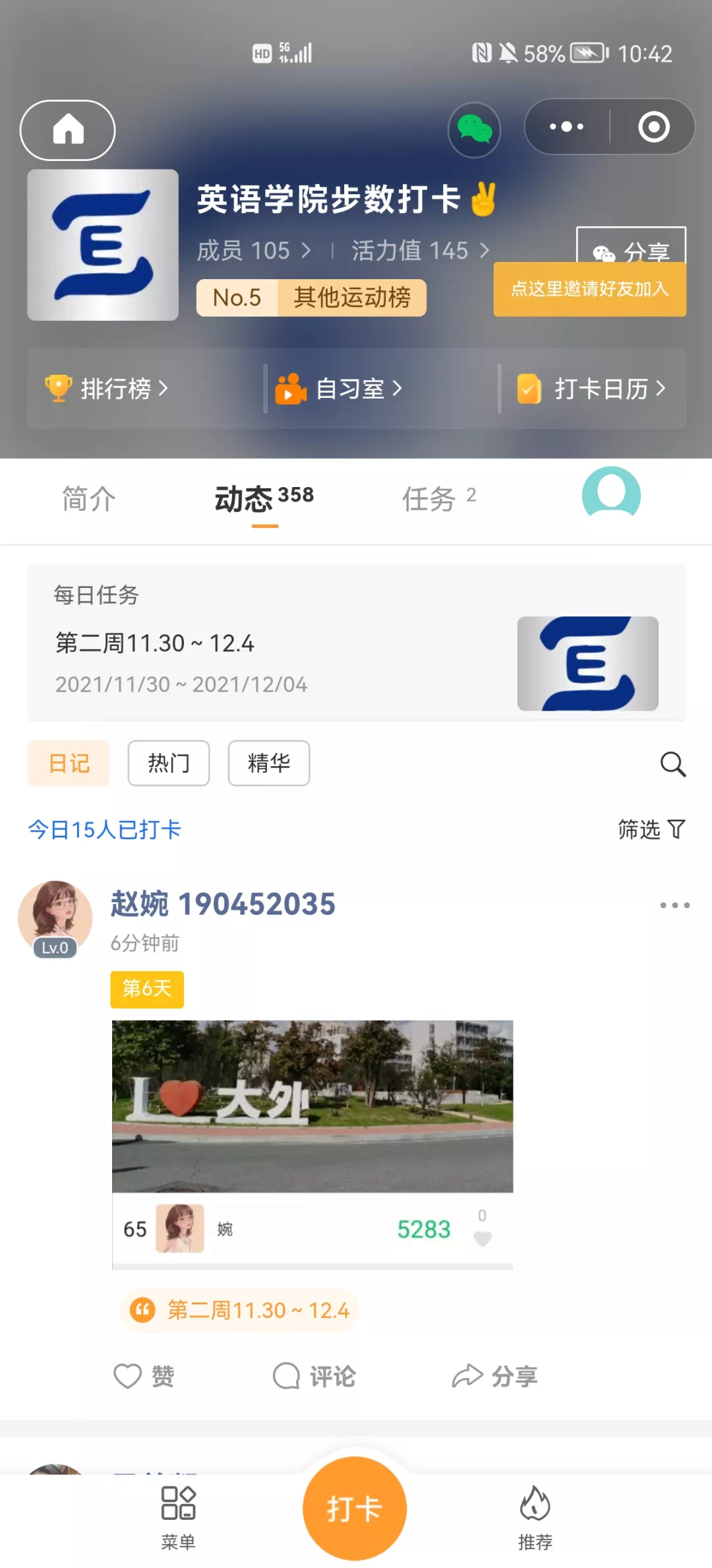 岁末将至,敬颂冬绥。本周,英语学院线上步数打卡活动和线下趣味活动相结合,积极开展“‘疫’中一条心,‘E’起动起来”主题趣味活动。运动是不会让人后悔的投资,当你爱上运动,健康也会爱上你。在网课期间,很多同学缺少锻炼,此次活动正激发了同学们锻炼体魄的热情,同学们的每一份坚持,每一份努力都在为良好的身体素质打下基础。