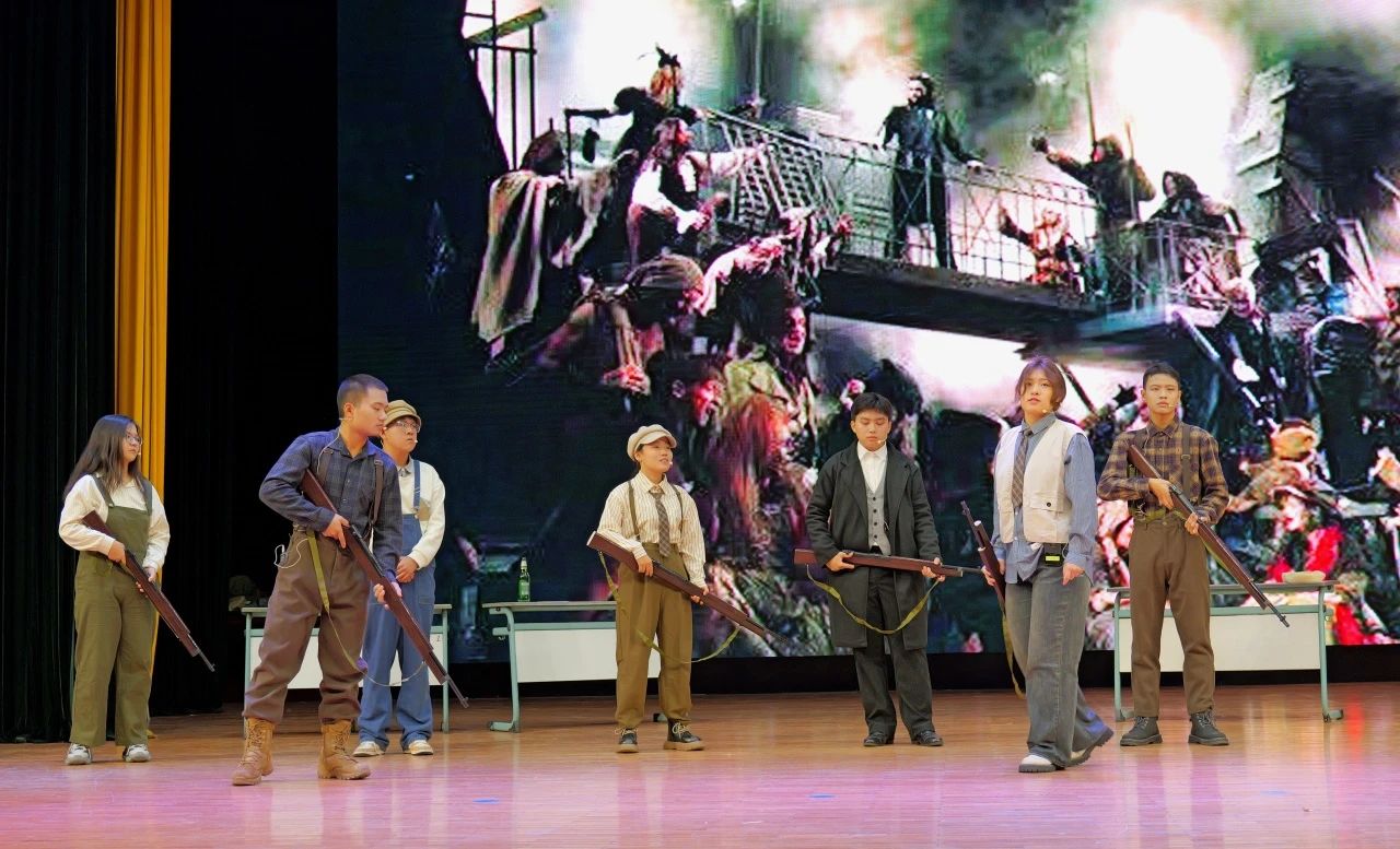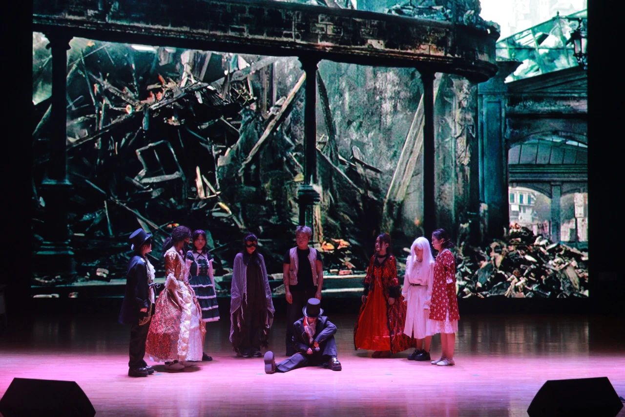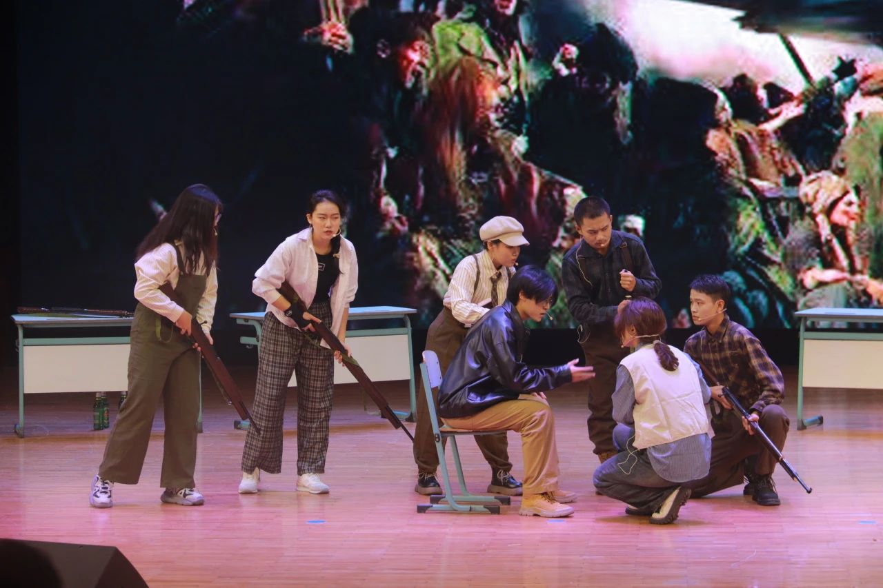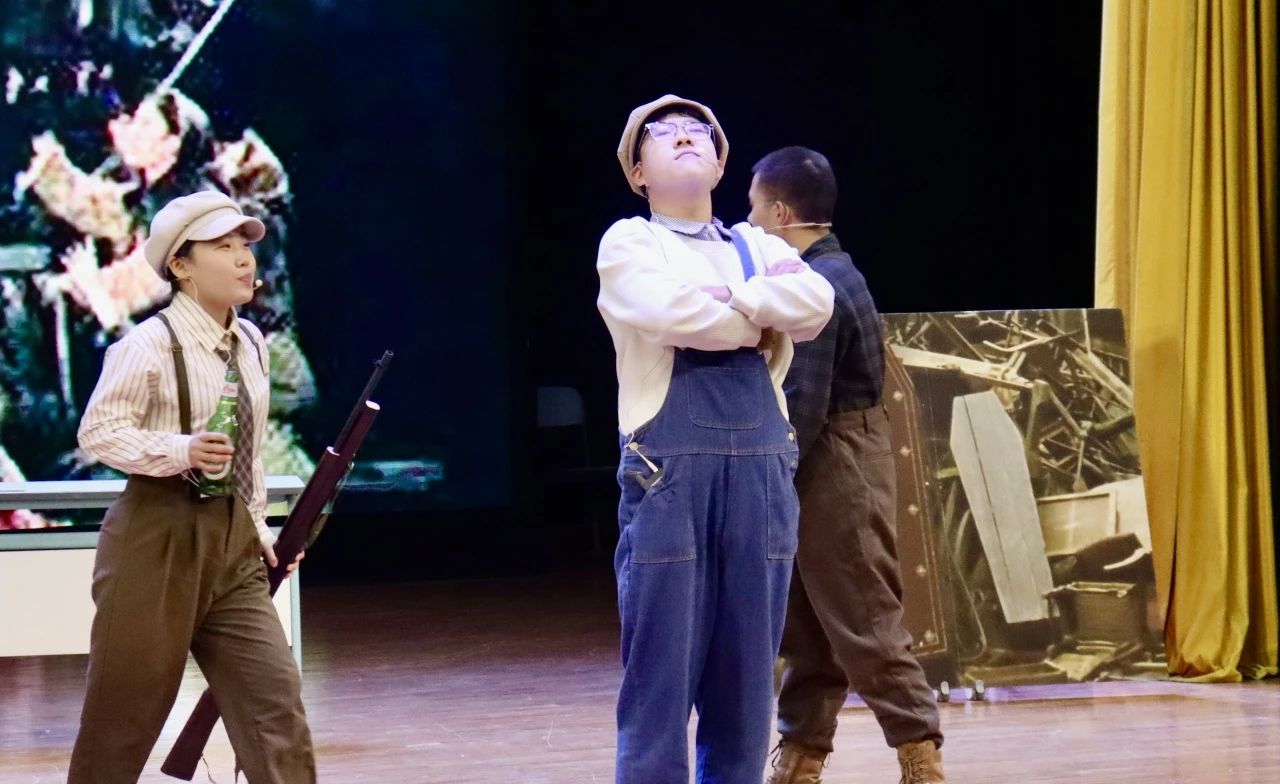 2023级剧组带来的《悲惨世界》拉开了本次展演的帷幕。本剧目主要讲述了以ABC社团为代表的革命成员在法国大革命前夕与间谍沙威和敌军发生激烈冲突的故事,展现出了大革命前后那个政权更迭、社会动荡、民不聊生的悲惨世界景象。在表演的过程中,演员们全情投入,声调高亢激昂,让观众们身临其境地感受那个充斥着尖锐阶级矛盾的法国社会。