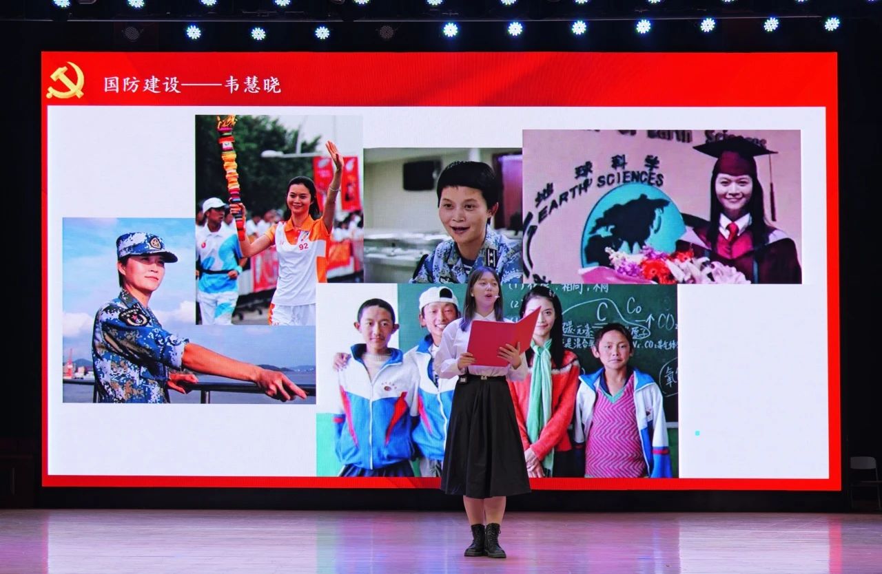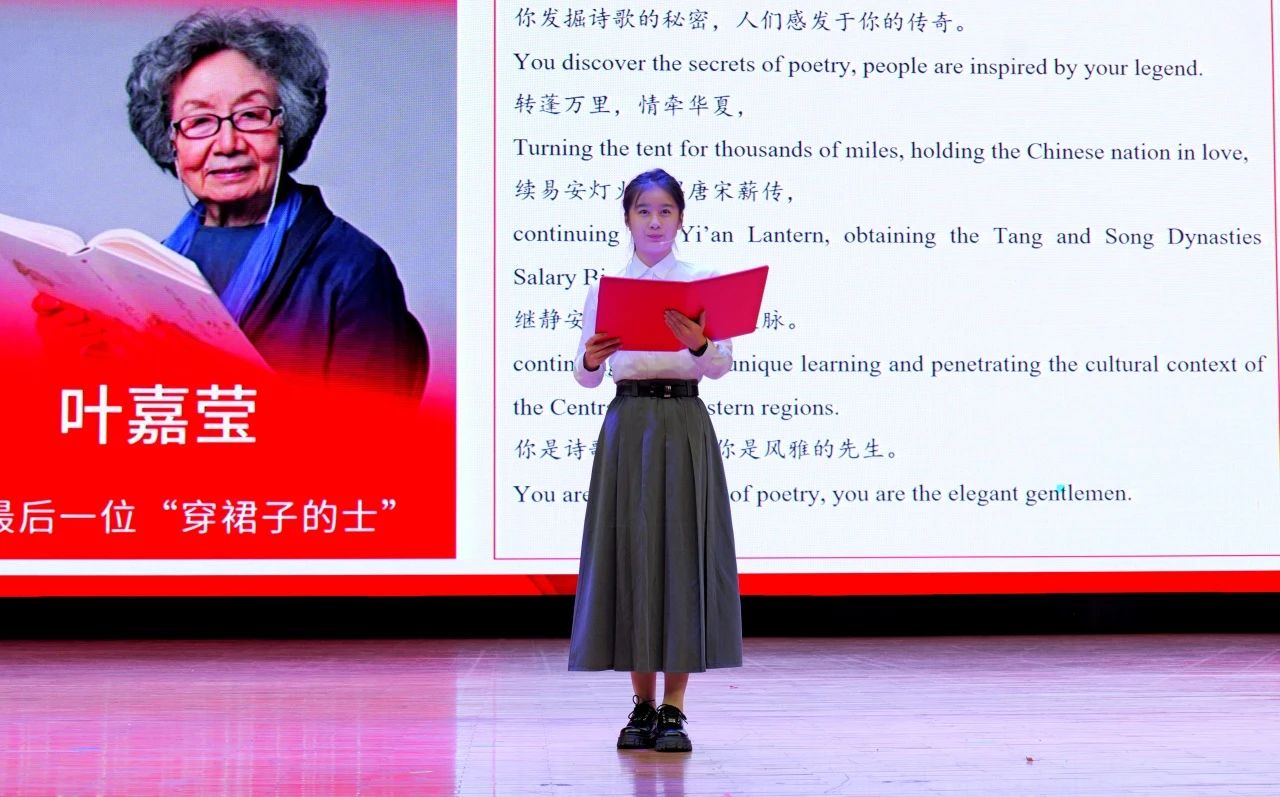中场表演环节中,由蒋美轩、李昕睿、张依然、汪思齐、许博雅五位同学带来的朗诵《中华儿女多奇志,巾帼风华满庭芳》讲述了韦慧晓、邓迎香、叶嘉莹、张桂梅、叶叔华五个人物的感人事迹,向在各个领域为祖国无私奉献的中华巾帼致以最崇高的敬意。
