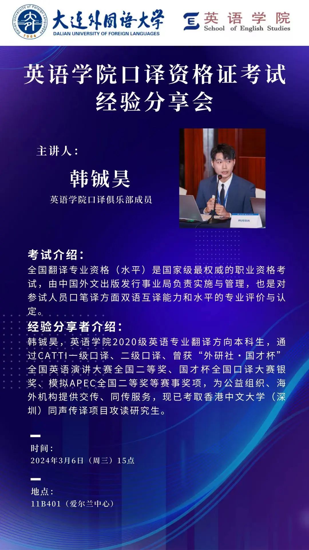 为了提高同学们的翻译水平,增加大家对CATTI备考相关内容的了解,英语学院口译俱乐部成员韩铖昊同学将于2024年3月6日(周三)15点在11B401(爱尔兰中心)与大家共分享其在口译学习和CATTI备考过程中的心得和经验。