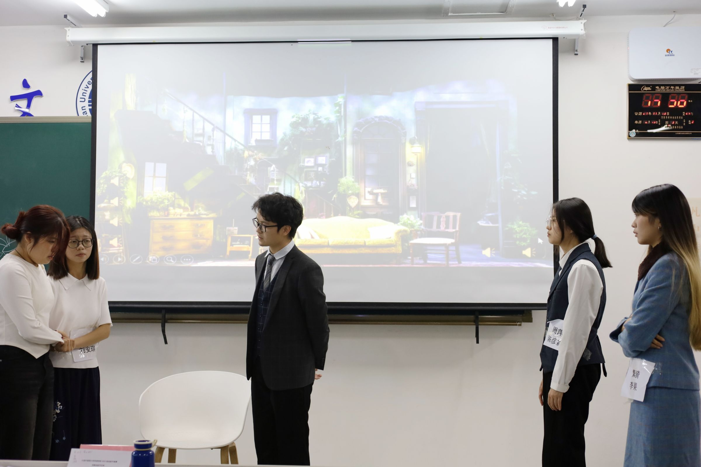 2023级年级复赛同样分为两个组别,于明德楼501教室和505教室同时进行。英语学院教师赵继鸿、谷华、陶续、黄洁芳、杨诗妍担任501教室评委,刘诗宇、王寒雪、姚香泓、刘艳荣、朱德全担任505教室评委。