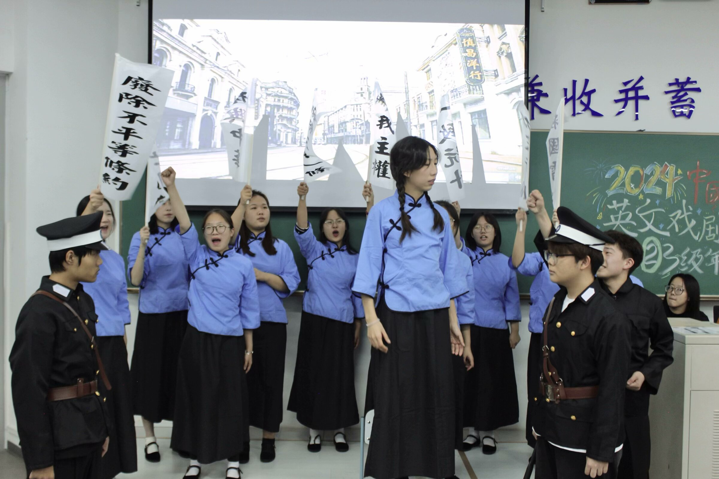 伴随着动听的歌声结束,接下来是由2024级6班带来的戏剧《茶馆》。该表演深刻展现了老北京胡同里的喜怒哀乐,小小的茶馆是社会的缩影,更是时代变迁的见证。同学们的表演充满感染力,台词富有感情,具有鲜明的时代特征。