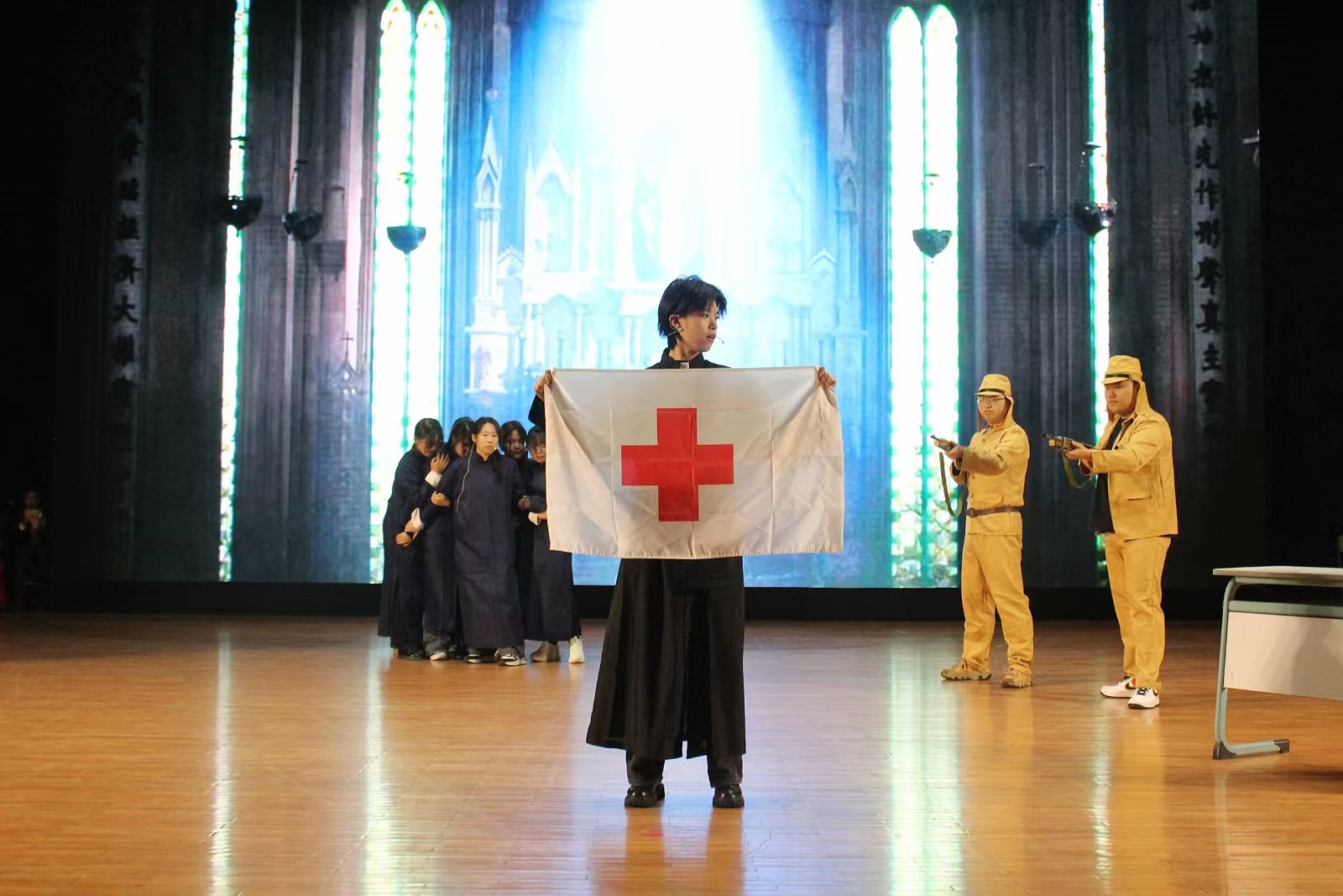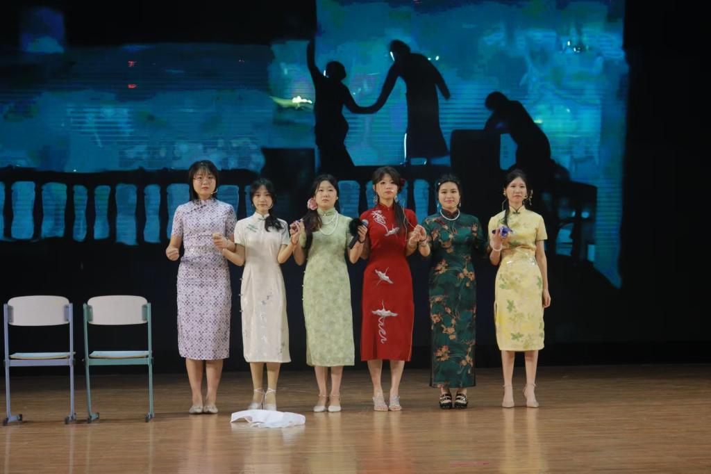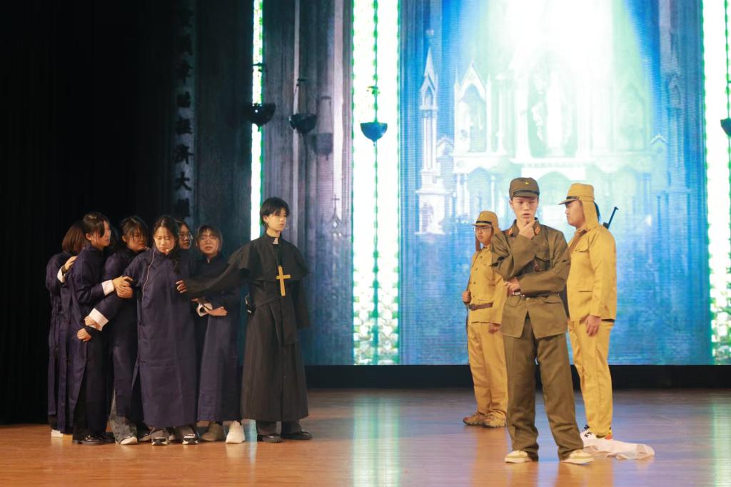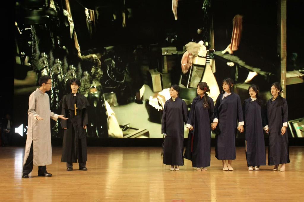 2022级剧组表演了经典电影《金陵十三钗》,故事发生在1937年饱受日军侵略的南京,讲诉了一群风尘女子们为保护受凌辱的女学生挺身而出,乔装打扮前往日军宴会,共赴悲壮死亡之约的故事。演员们真情流露、声泪俱下的表演,带观众们走进那段战火纷飞的岁月,目睹一部舍生取义、大义凛然的壮丽史诗。