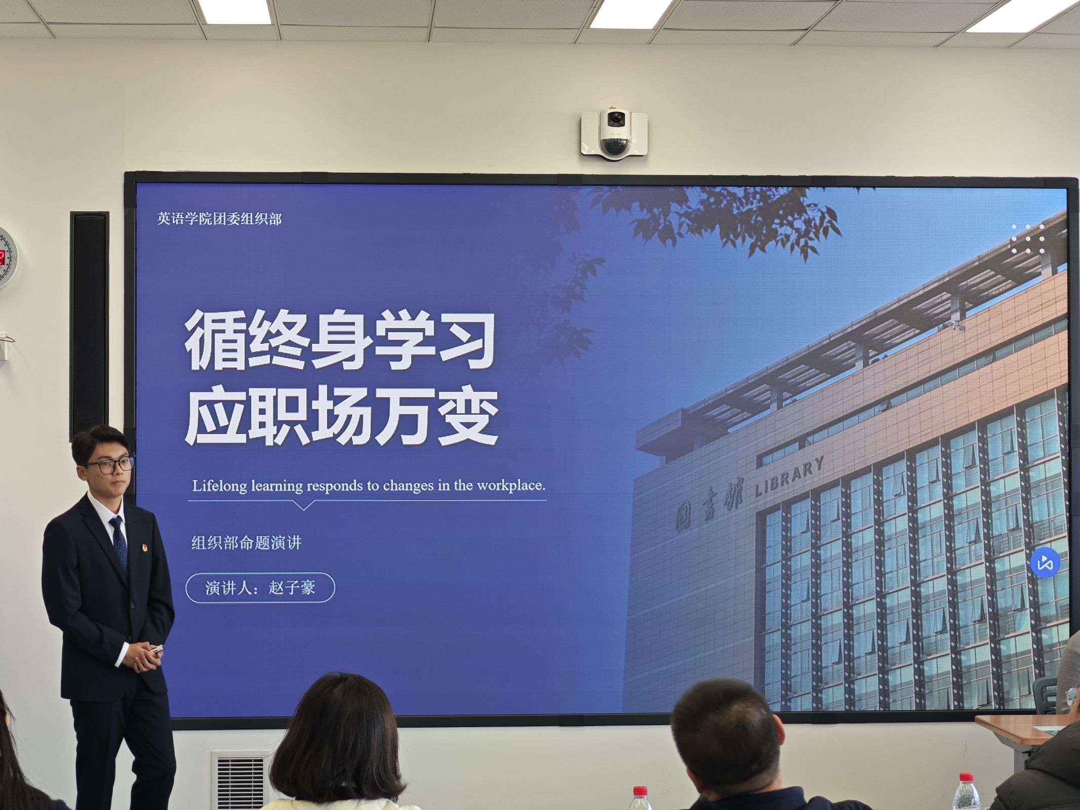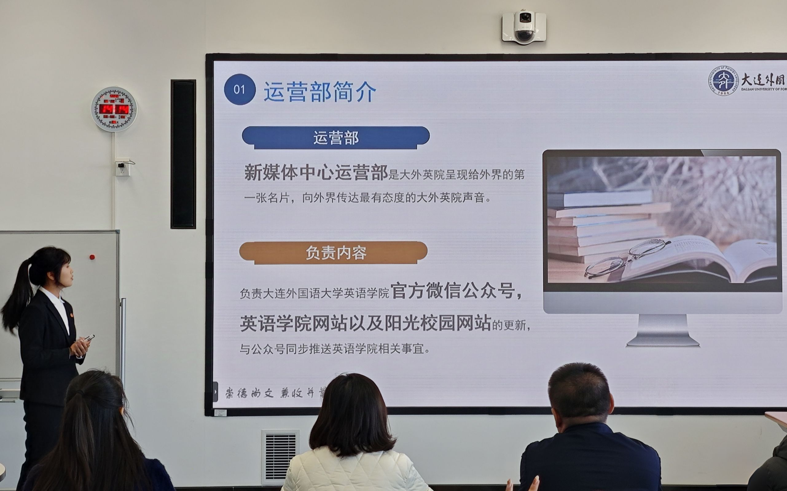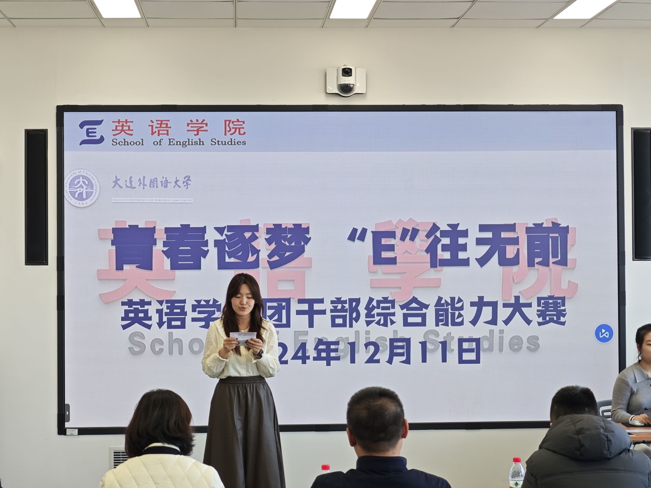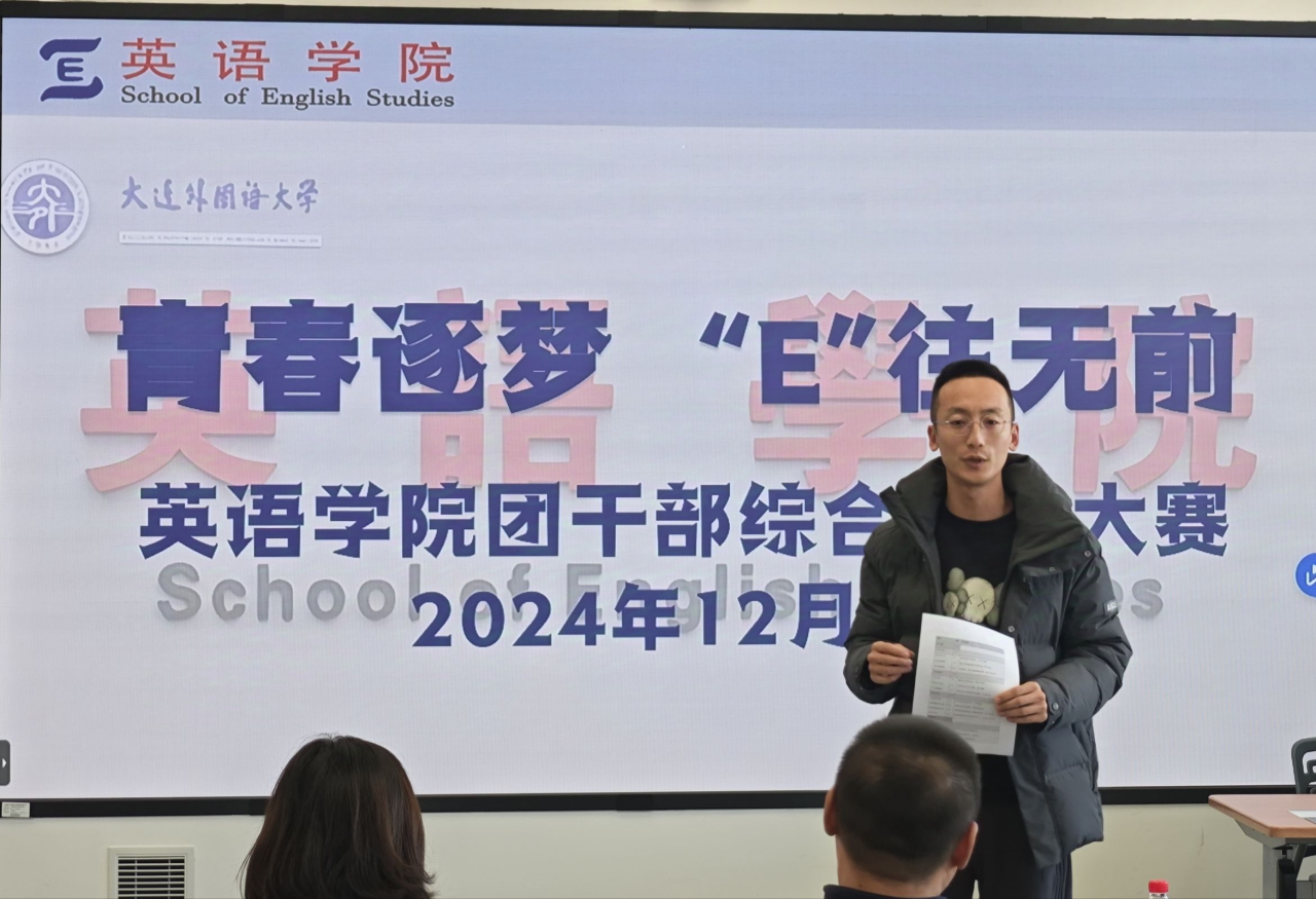 12月11日,英语学院团干部综合能力大赛决赛于励业楼402室成功举办。大连外国语大学英语学院党委副书记兼纪委书记孙硕、大连交通大学机械工程学院团委书记王衍、大连外国语大学德语学院团委书记温丽娜、大连外国语大学校团委干事翟芮及大连外国语大学英语学院团委书记曲镜达担任此次比赛评委。