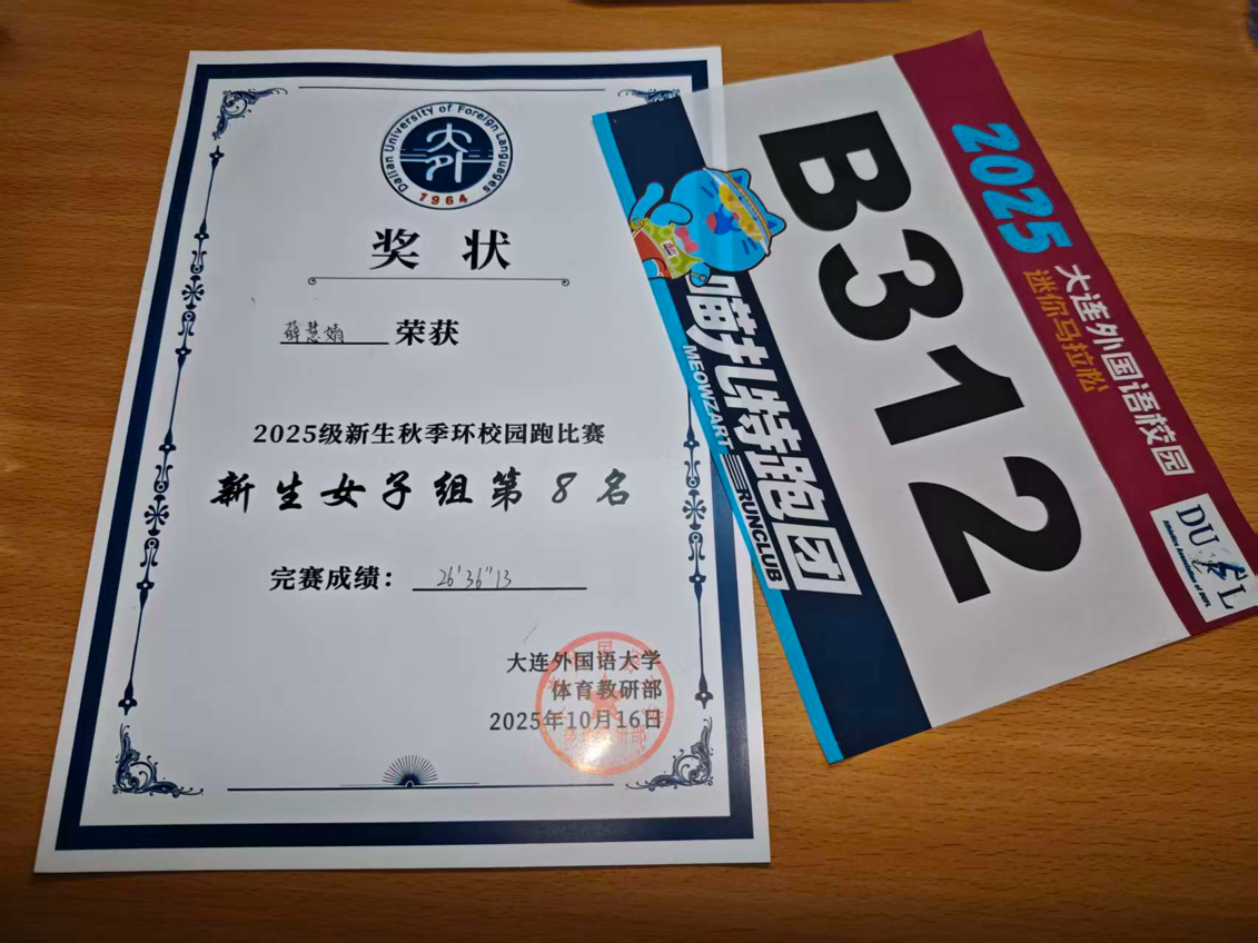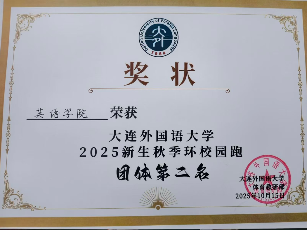 为积极响应学校全面育人号召,营造蓬勃向上的校园体育文化氛围,大连外国语大学于2025年10月15日成功举办2025新生秋季环校园跑比赛。在此次比赛中,英院学子团结一心、奋勇拼搏,最终斩获团体总分第二名的优异成绩。其中,付检桐同学荣获老生男子组第一名;汪静与薛慧婧同学分获新生女子组第二名与第八名。他们以奔跑诠释青春,用拼搏凝聚力量,共同为学院赢得了这份来之不易的荣誉。