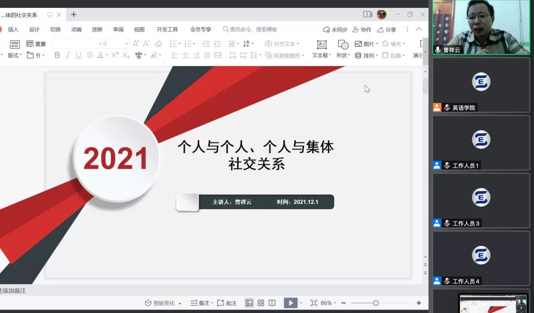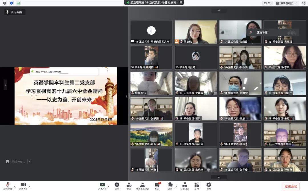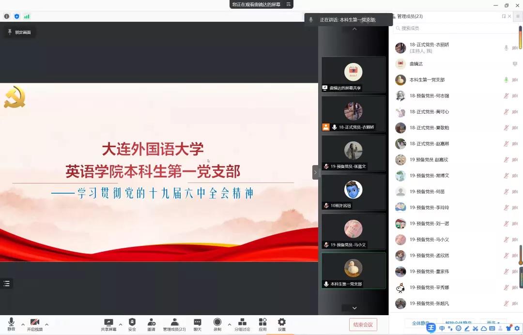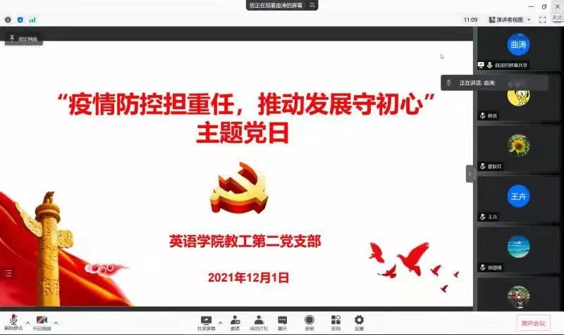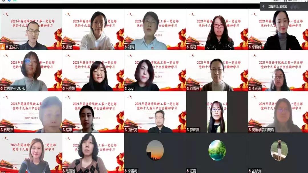 为深入学习贯彻落实党的十九届六中全会精神,英语学院各支部组织党员开展了以“疫情防控担重任,推动发展守初心”为主题的线上党日学习。此次主题学习教育有助于深化全体党员对十九届六中全会的重要里程碑意义的认识与体会,增强“四个意识”、坚定“四个自信”,厚重了担当时代重任的使命感,高涨了干事创业的激情与斗志,为更加坚定、更加自觉地践行“立德树人”的初心使命,推进教学科研各项工作和疫情防控的统筹开展,保障学院各项事业的高质量发展注入了令人振奋的思想动力,凝聚了催人奋进的精神力量。