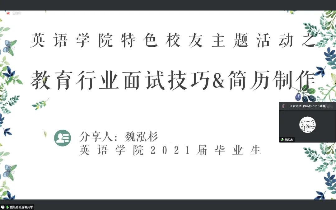 为丰富同学们的择业知识,拓宽就业思路,英语学院邀请2017级校友魏泓杉举行了特色校友主题活动之就业经验分享会。校友魏泓杉就教育方面的职业选择、职场中的心得体会为同学们进行了详细的讲解与剖析,并鼓励同学们在未来的奋斗之途上,敢于拼搏尝试,不畏失败与困难,既有越挫越勇的执着,也有笑对人生冷暖的豁达。这次就业经验分享会让同学们积累了更多宝贵的求职经验。